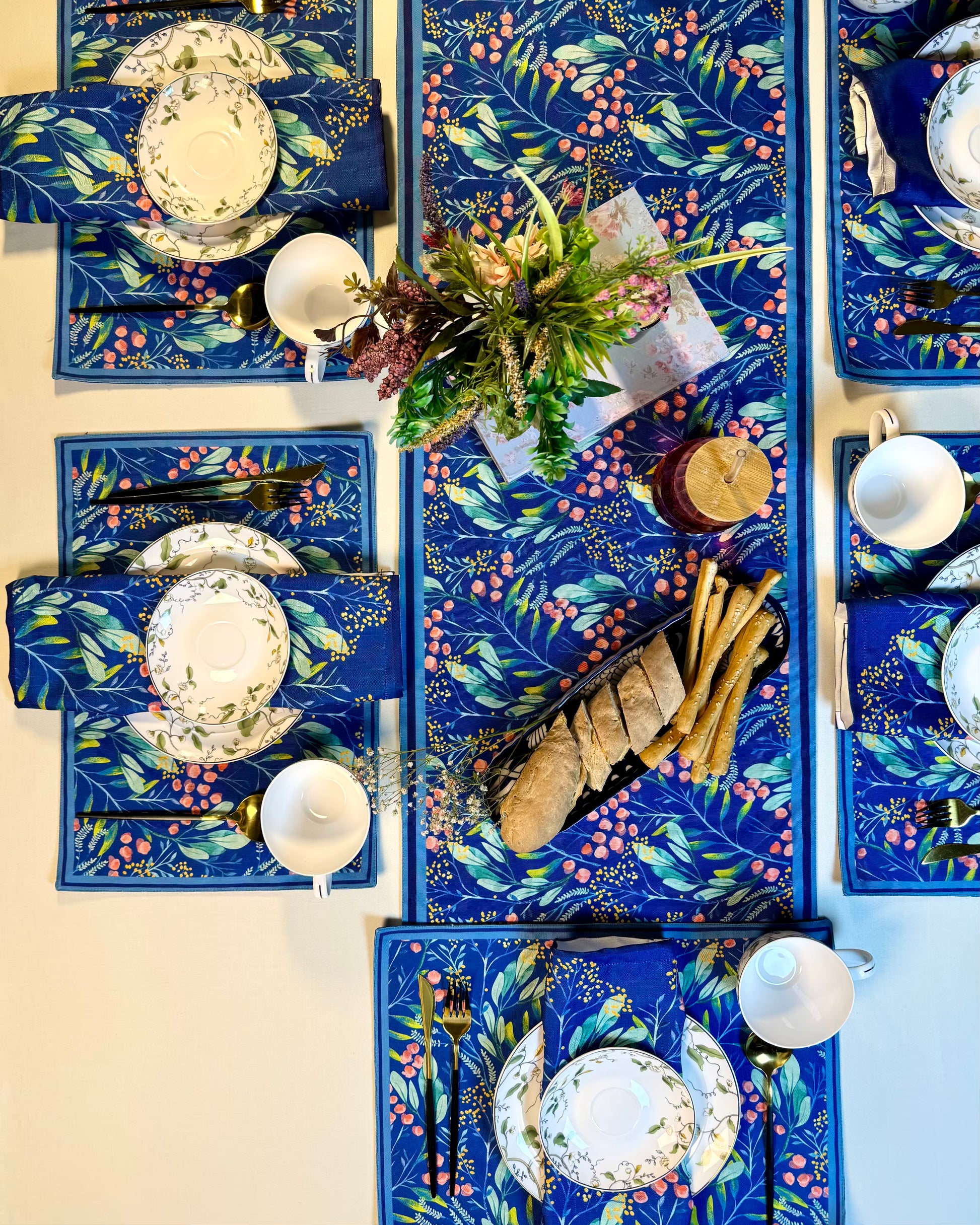 - 5 piece set contains: One (1) Runner of 72 x 15 inches and four (4) placemats of 12 x 18 inches each