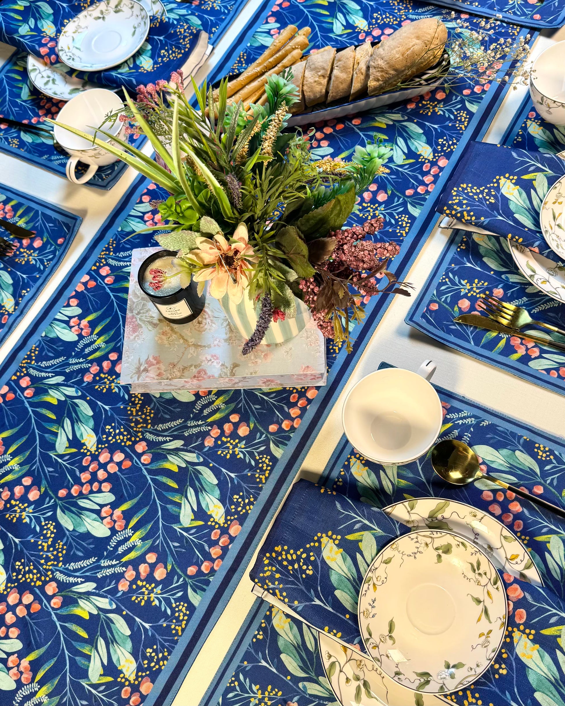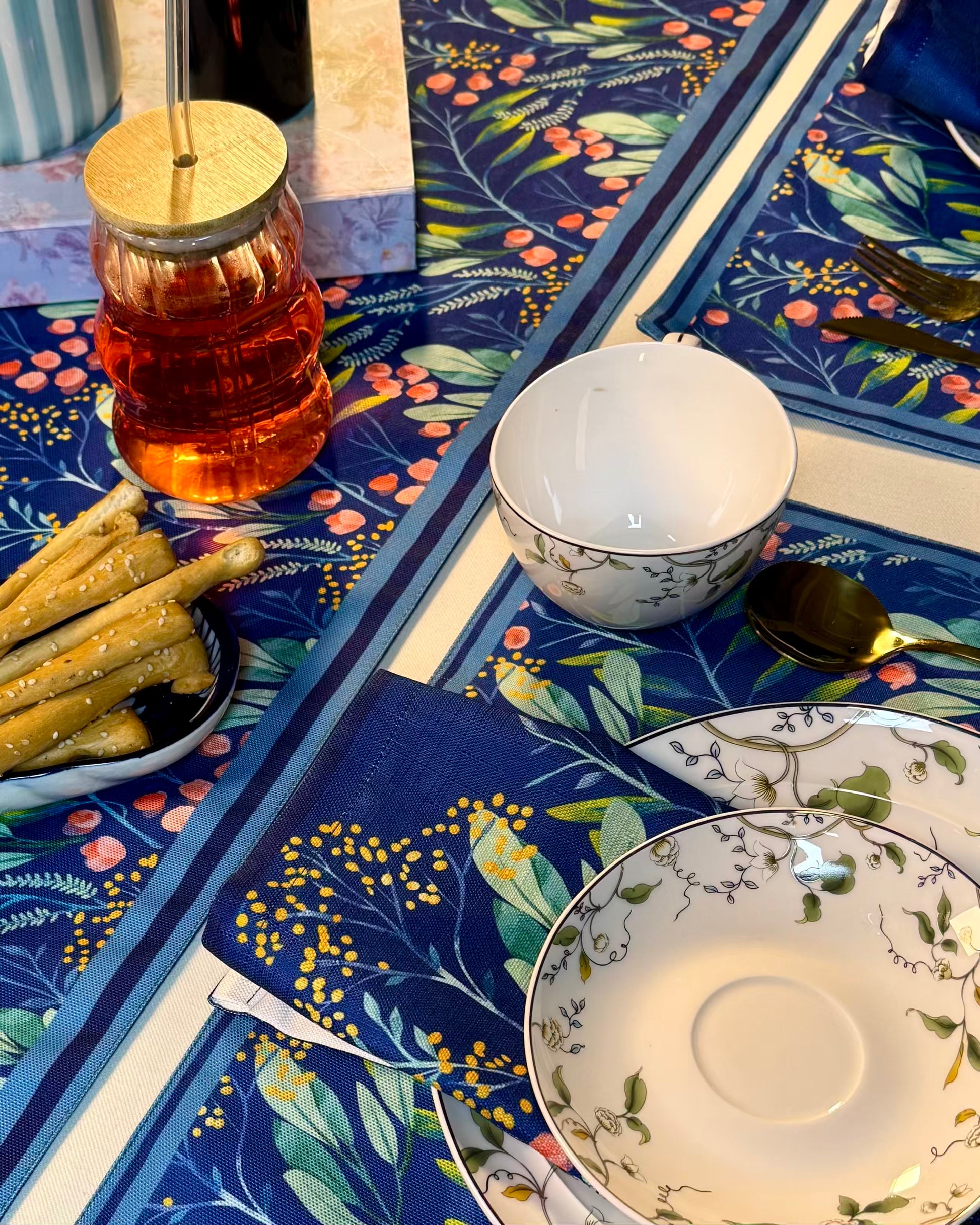 A gentle garden unfurls on a deep midnight-blue canvas, where tiny blooms, fluttering leaves, and rosy berries dance in quiet harmony. Soft shades of pink, teal, and yellow weave through the pattern, framed delicately by a pale blue border, creating a serene and inviting tableau.