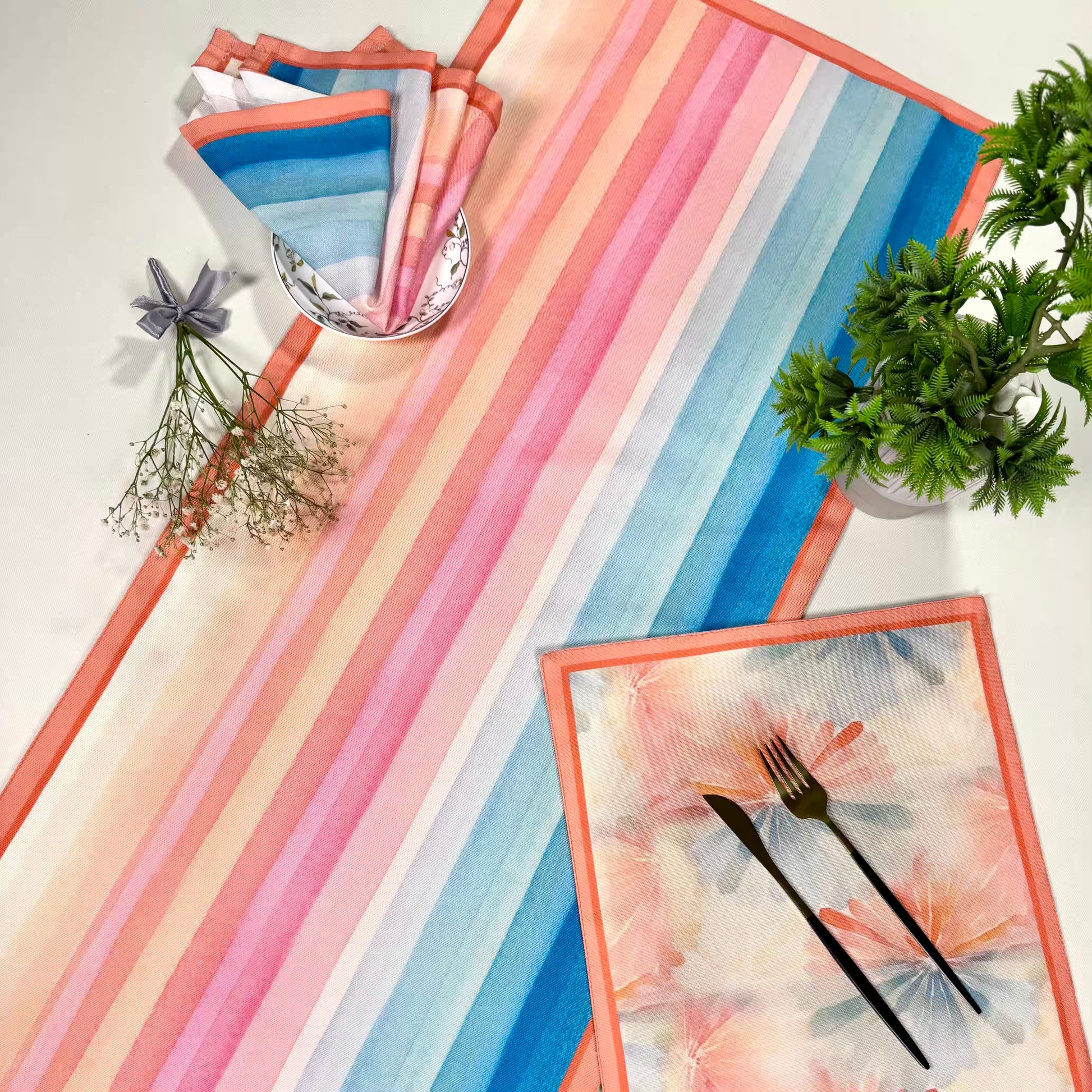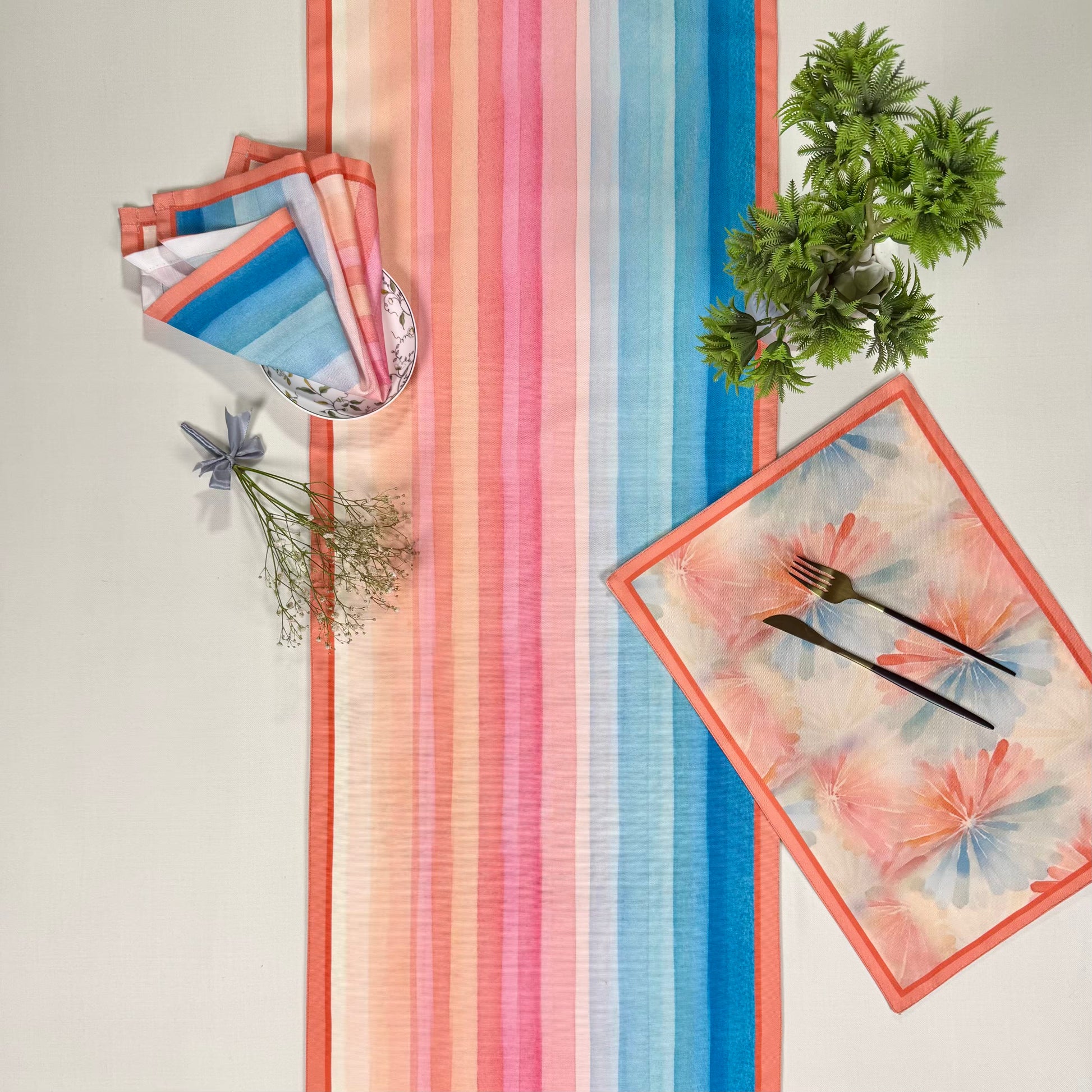 Petals like whispered brushstrokes bloom in soft coral, peach, and light blue, drifting gently across a serene, creamy canvas. Each cluster flows with the delicate fluidity of watercolour, colours blending and bleeding softly into one another, airy and luminous. A coral border frames the scene like a quiet, warm embrace, while subtle textures beneath invite the touch, turning colour and form into gentle, tactile poetry.