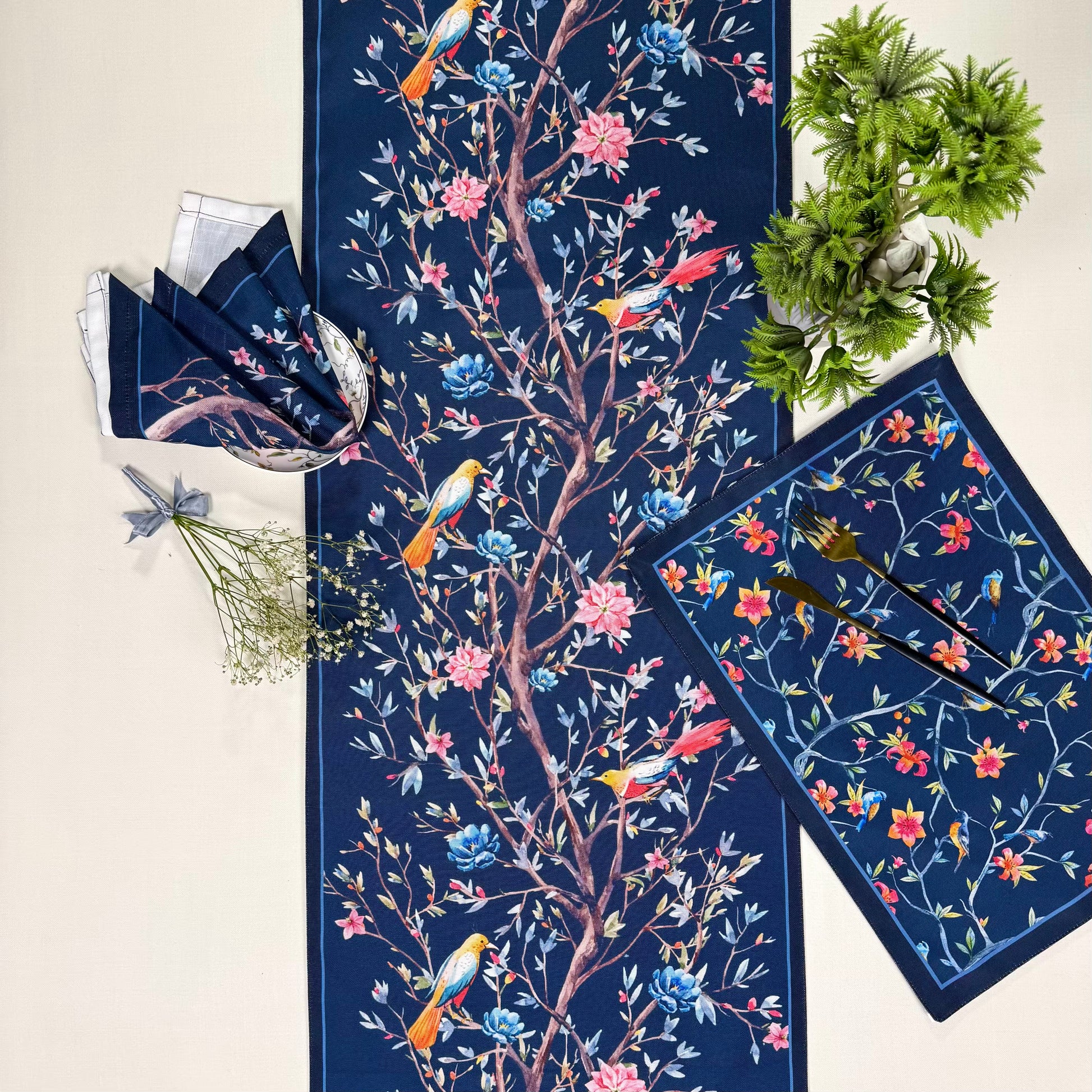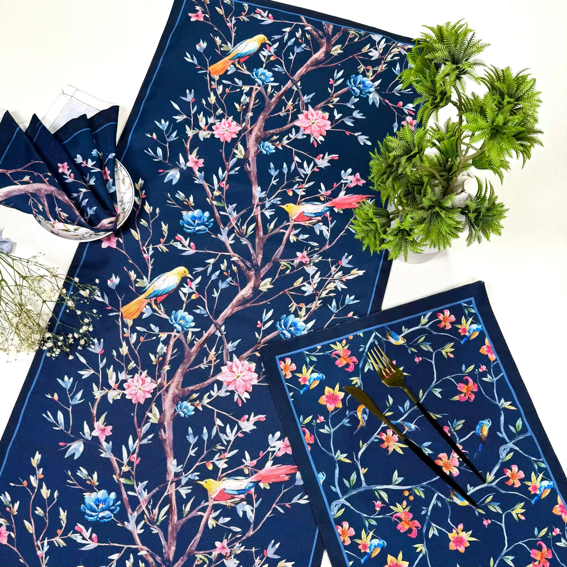 A symphony of colour unfolds across a deep navy canvas, where cheerful birds perch among blossoms in shades of pink, orange, and yellow. Delicate branches weave through the design, creating a harmonious, repeating pattern that fills the placemat with life and movement.
