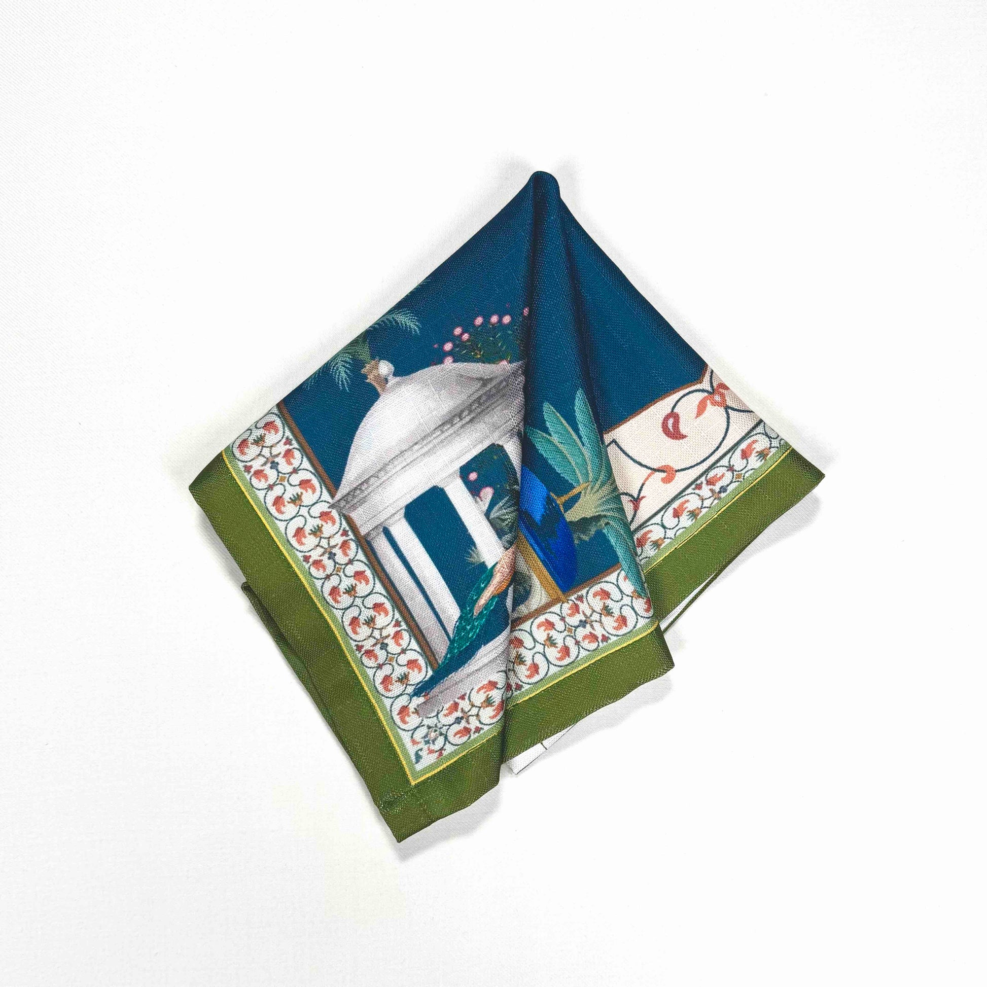 Step into a teal-hued paradise where ornate stone arches blend with lush palms and vibrant blooms. Majestic peacocks and a scarlet macaw add pops of color, all framed by delicate lattice details. Perfect for bringing timeless tropical elegance to any space.