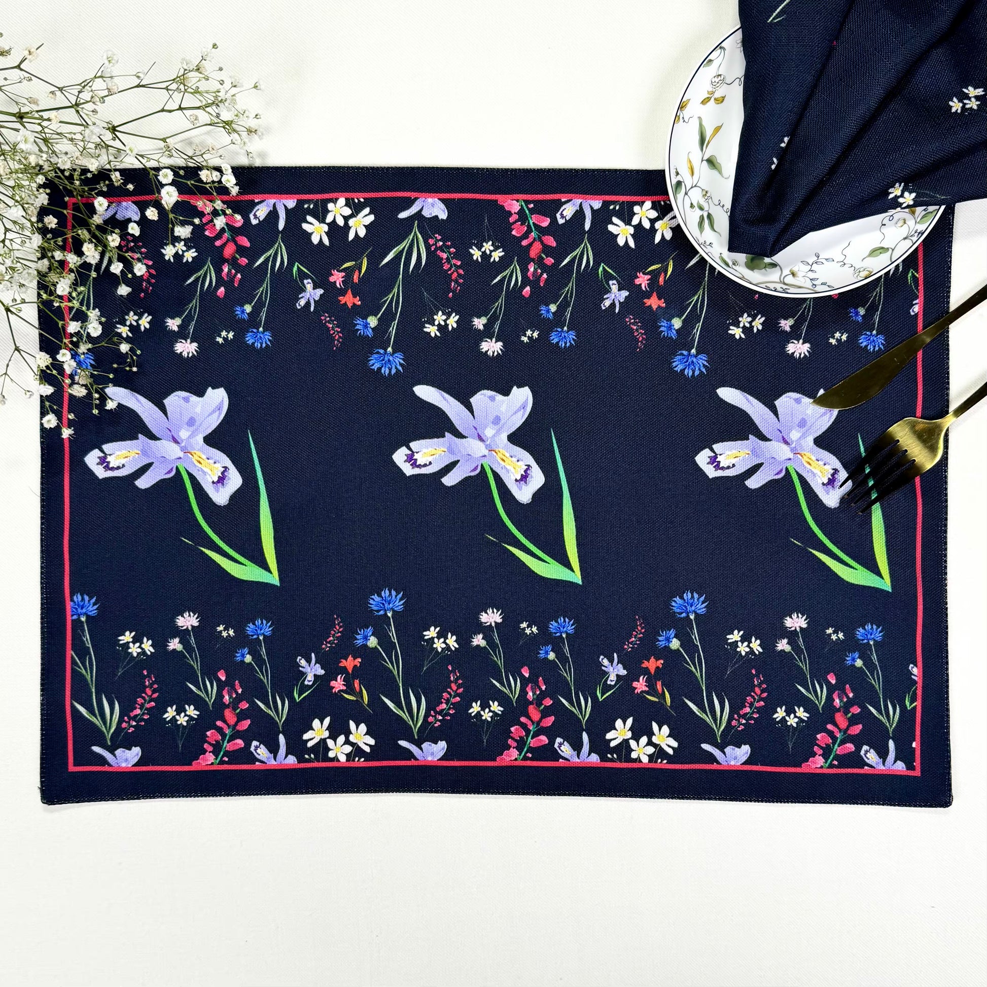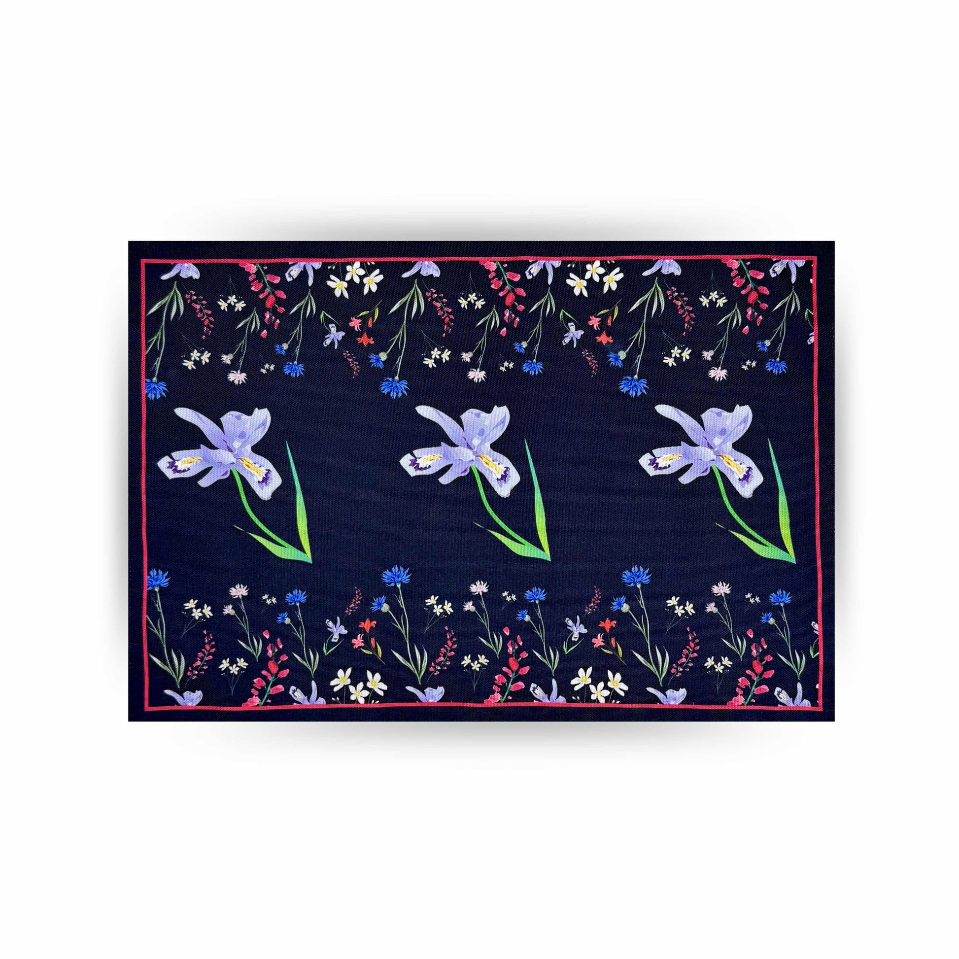 A garden of wildflowers blooms against a deep black, with elegant irises taking centre stage amidst a tapestry of colourful blossoms. Smaller wildflowers line the edges, creating a rhythmic, repeating pattern that brings harmony and balance to the design. A subtle red border frames the composition, adding a refined touch of contrast.