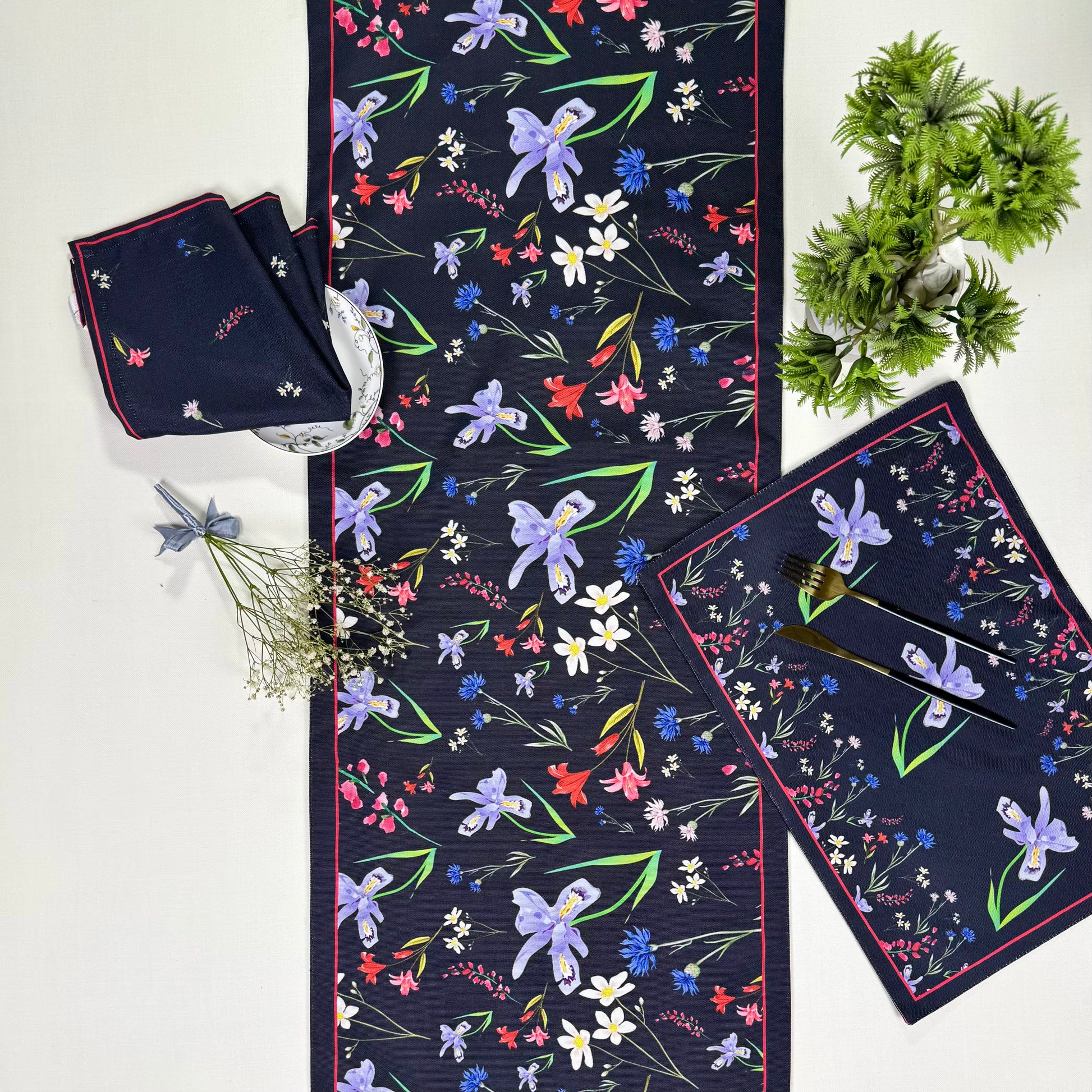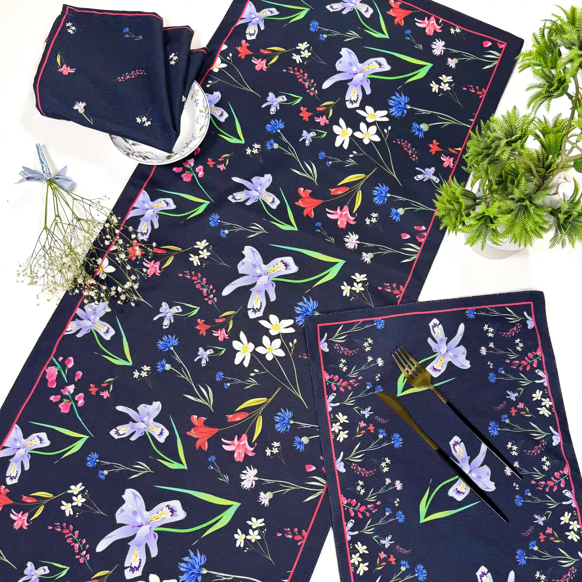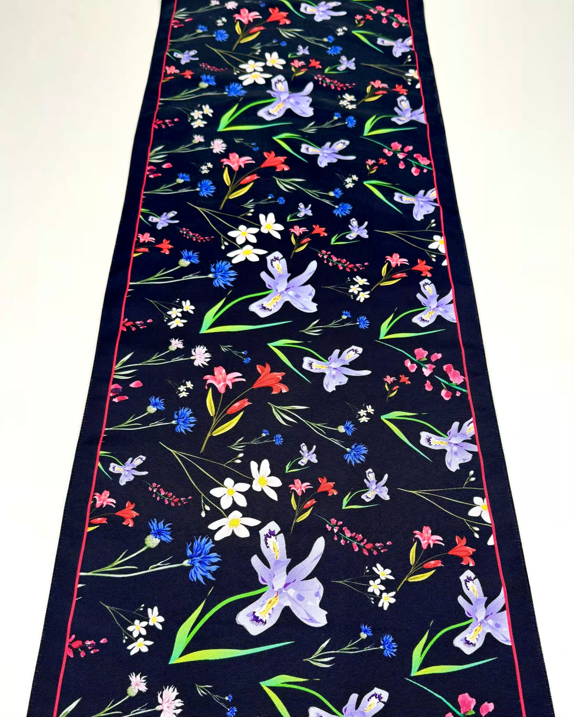 A garden of wildflowers blooms against a deep black, with elegant irises taking centre stage amidst a tapestry of colourful blossoms. Smaller wildflowers line the edges, creating a rhythmic, repeating pattern that brings harmony and balance to the design. A subtle red border frames the composition, adding a refined touch of contrast.