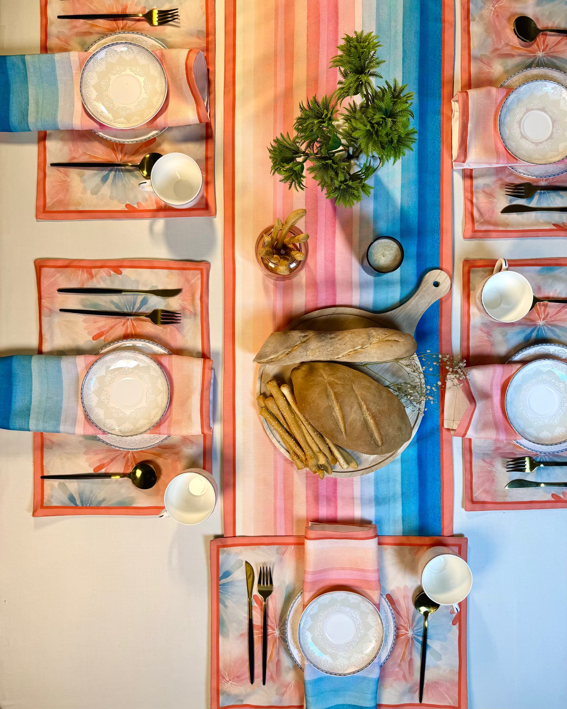 - 9 piece set contains: One (1) Runner of 110 x 15 inches and eight (8) placemats of 12 x 18 inches