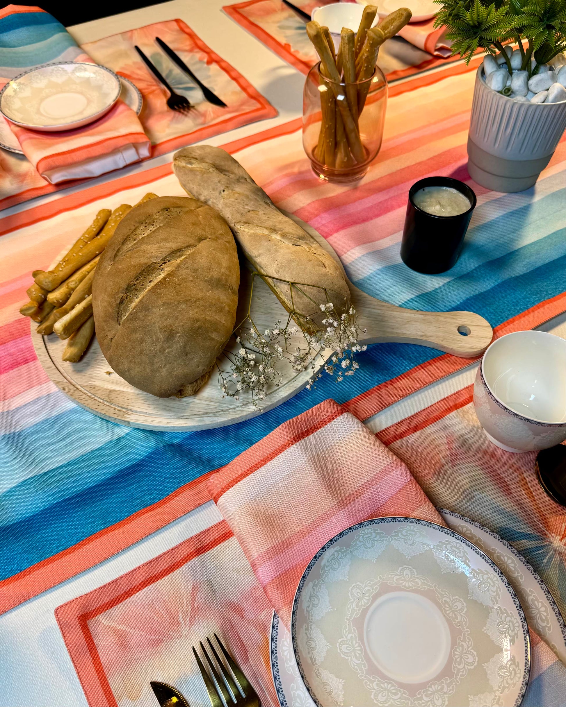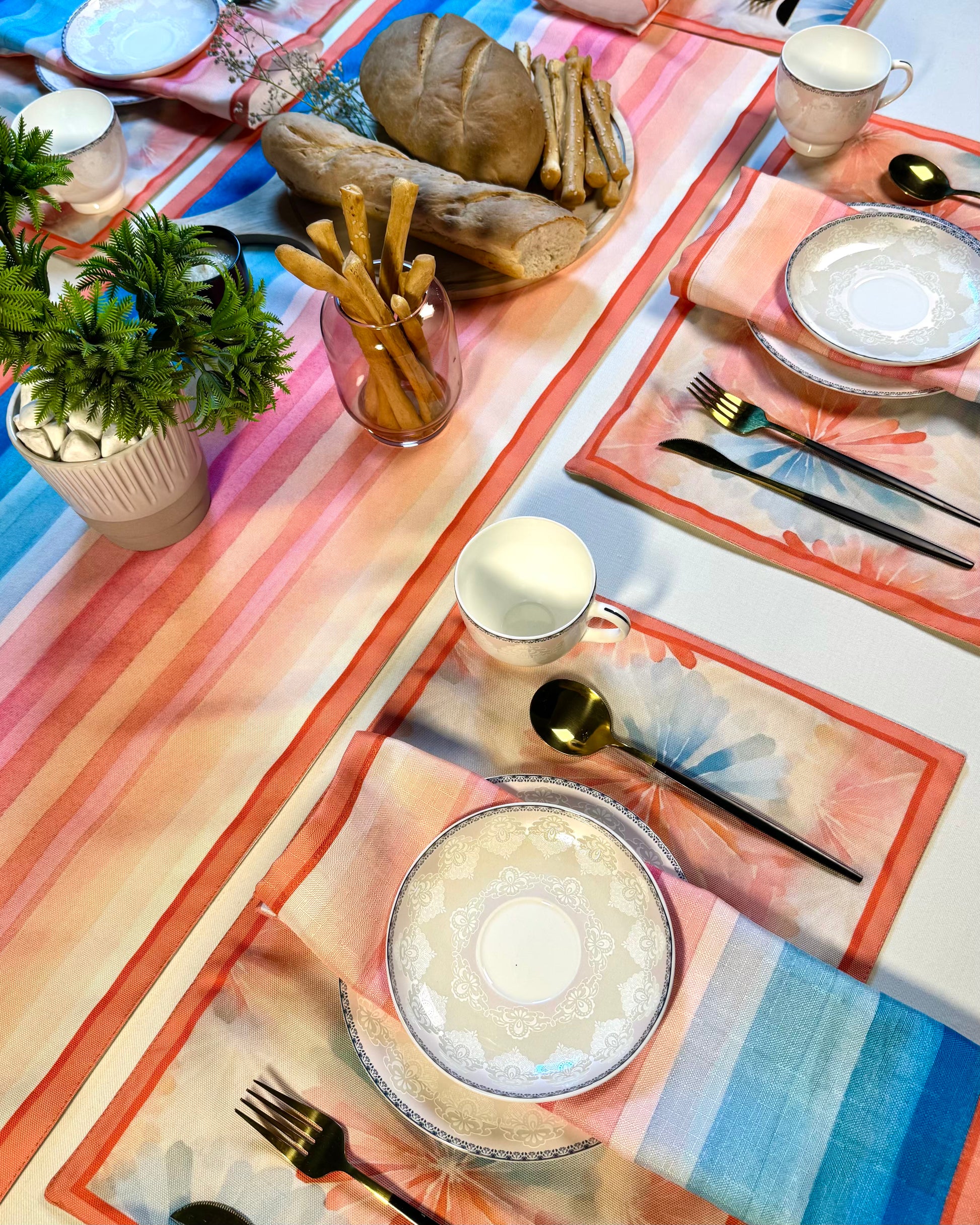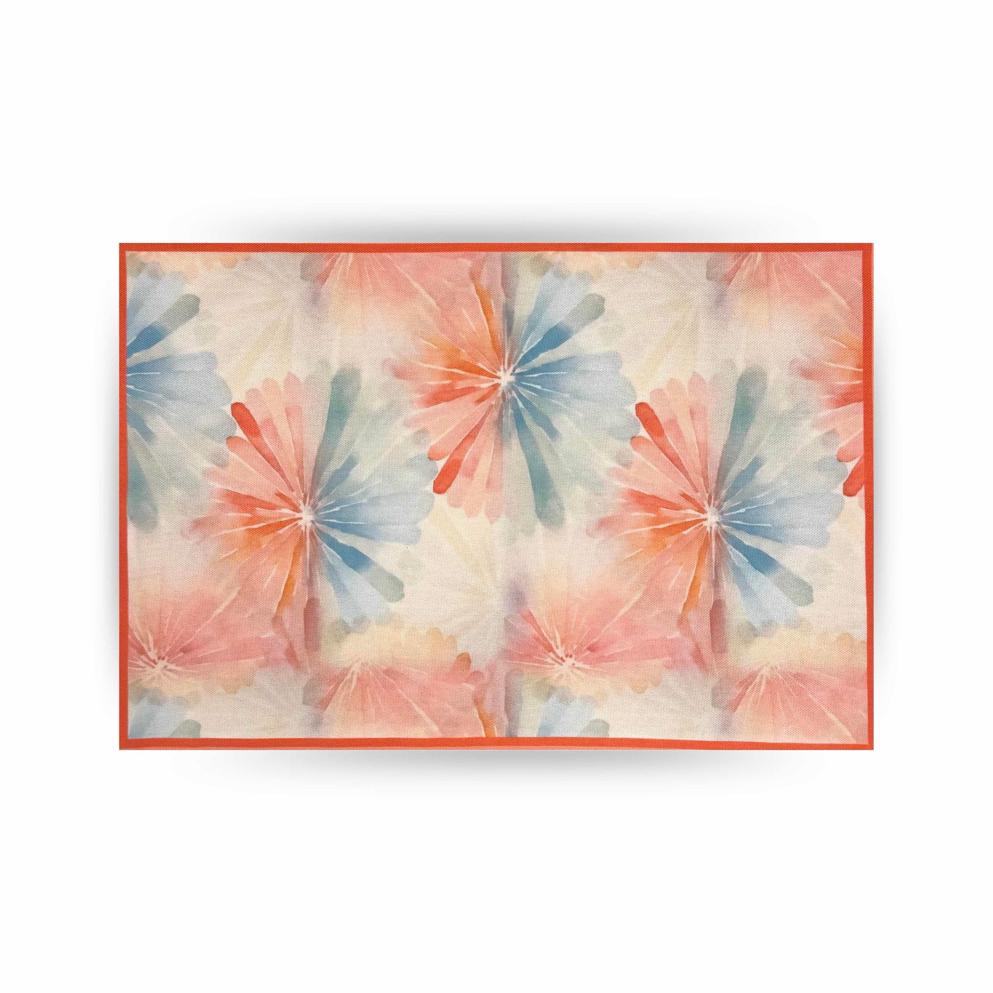 Petals like whispered brushstrokes bloom in soft coral, peach, and light blue, drifting gently across a serene, creamy canvas. Each cluster flows with the delicate fluidity of watercolour, colours blending and bleeding softly into one another, airy and luminous. A coral border frames the scene like a quiet, warm embrace, while subtle textures beneath invite the touch, turning colour and form into gentle, tactile poetry.