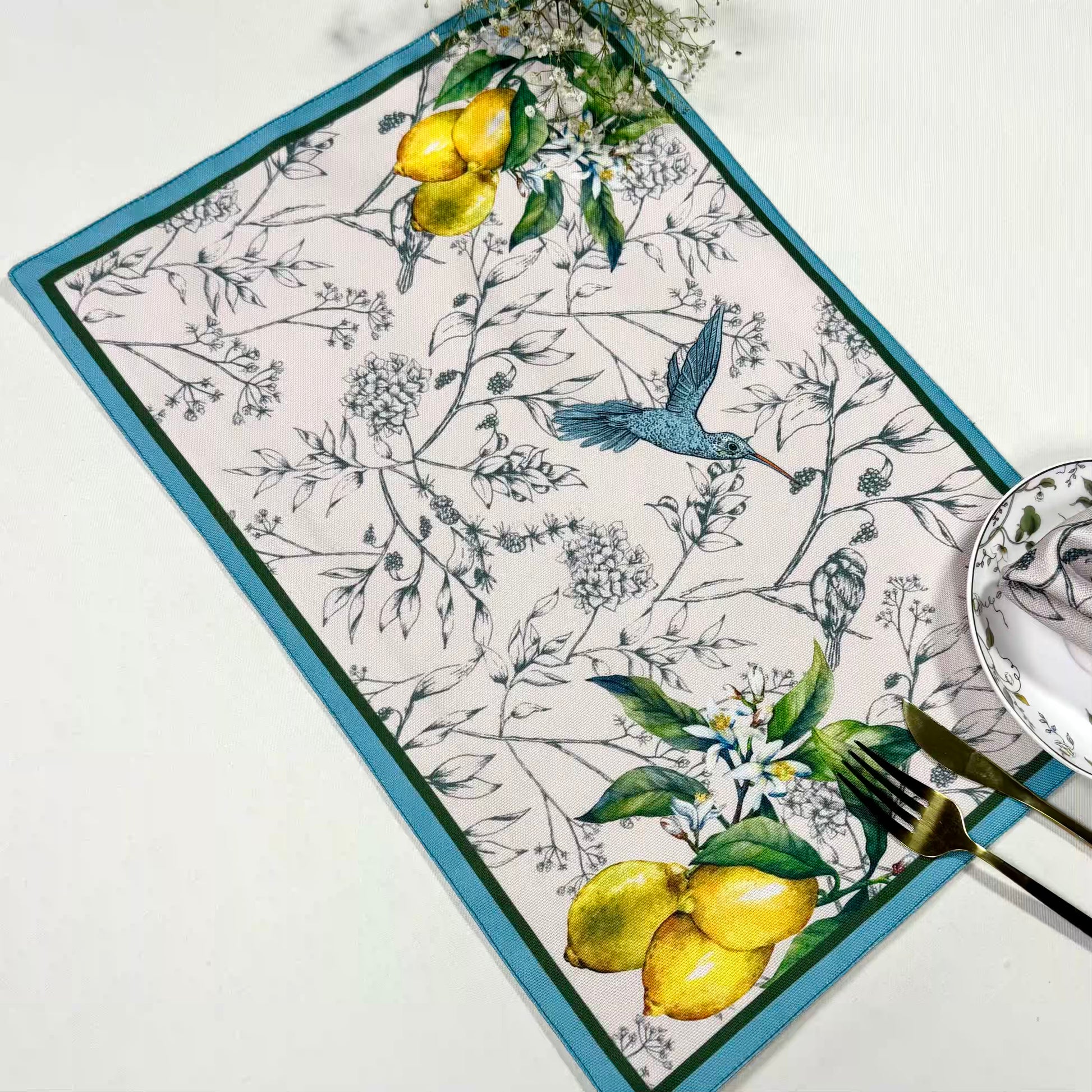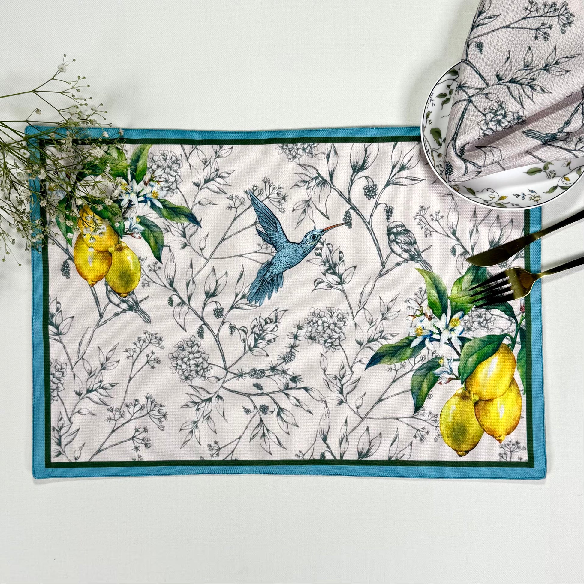 A gentle garden comes to life where vibrant lemons hang from leafy branches and hummingbirds hover delicately among blossoms. Each flower, fruit, and feather is rendered with detailed line work and subtle shading, creating a harmonious, repeating pattern that feels both lively and serene. A complementary teal border frames the design, adding a crisp, elegant finish.