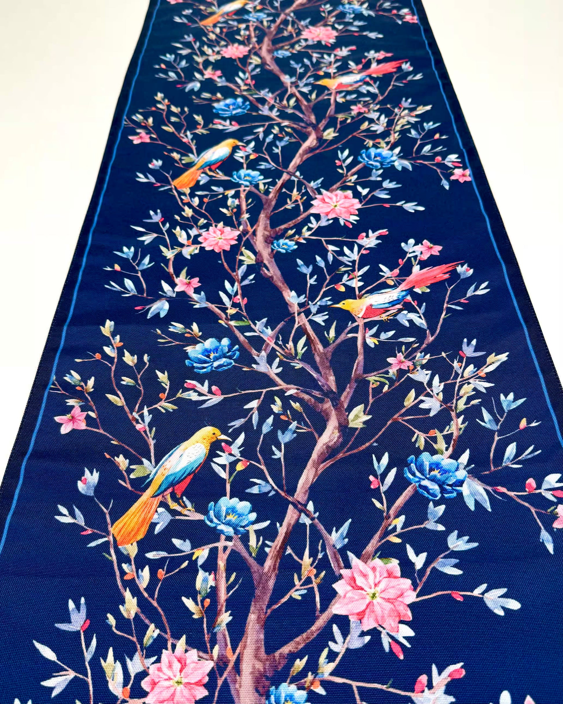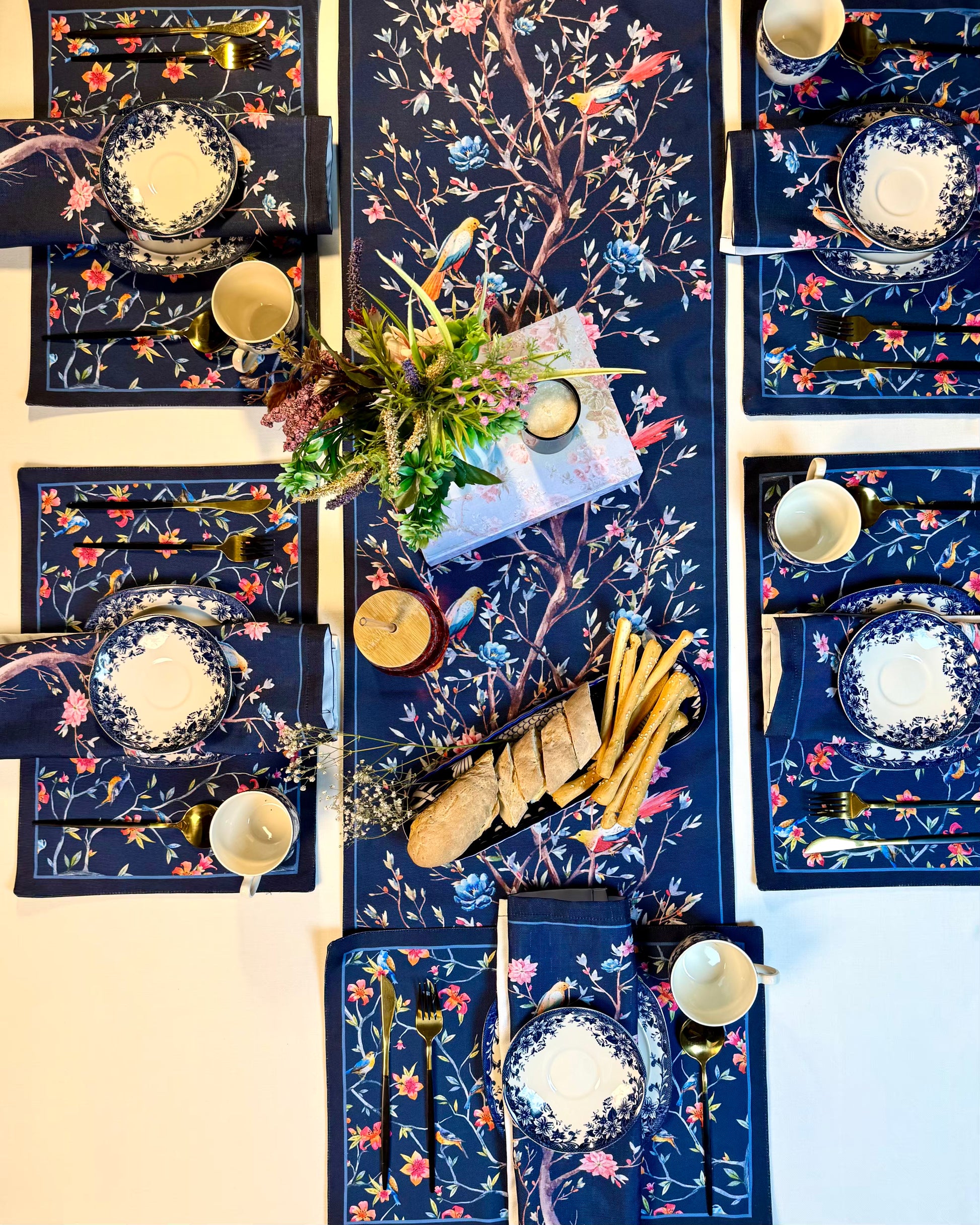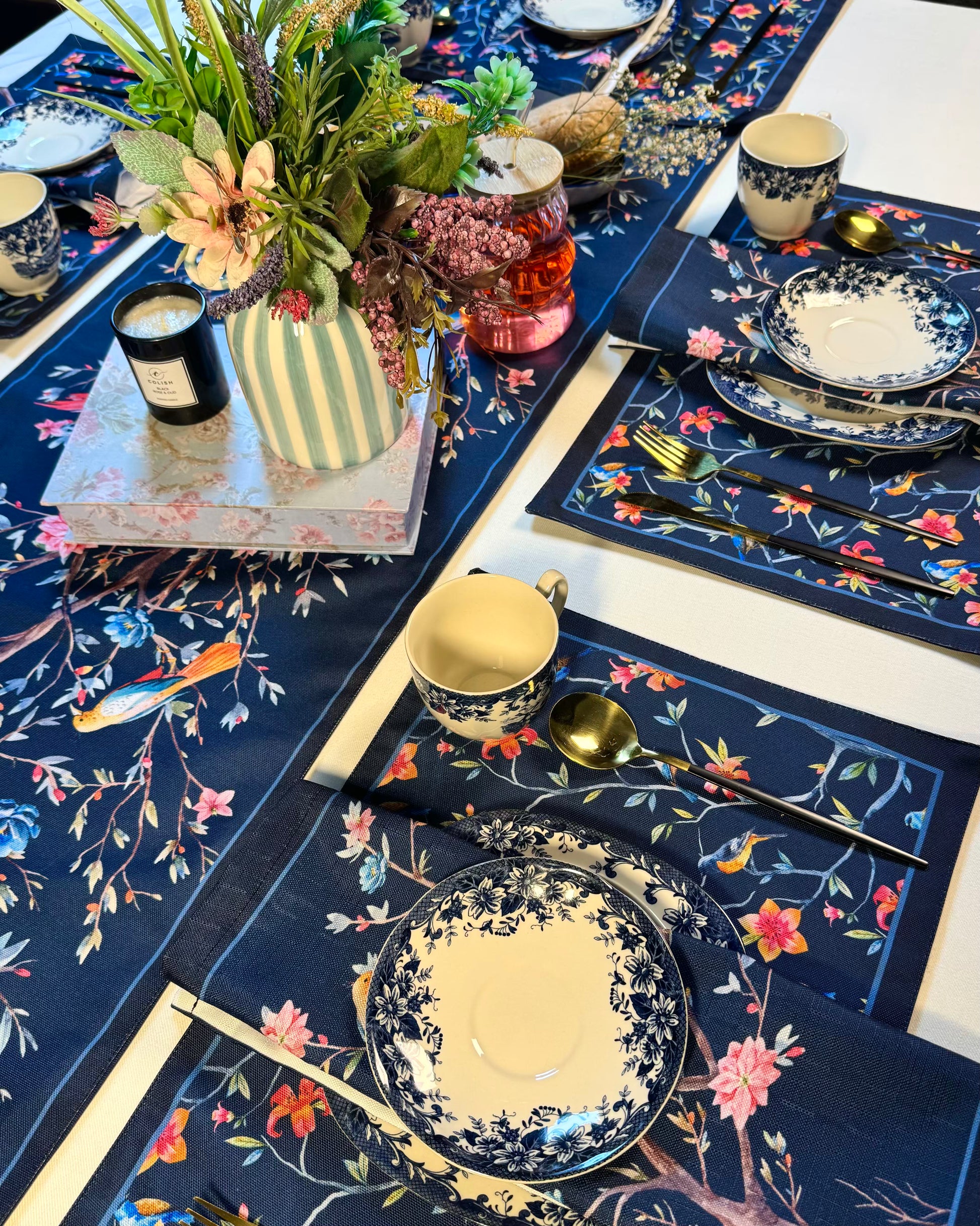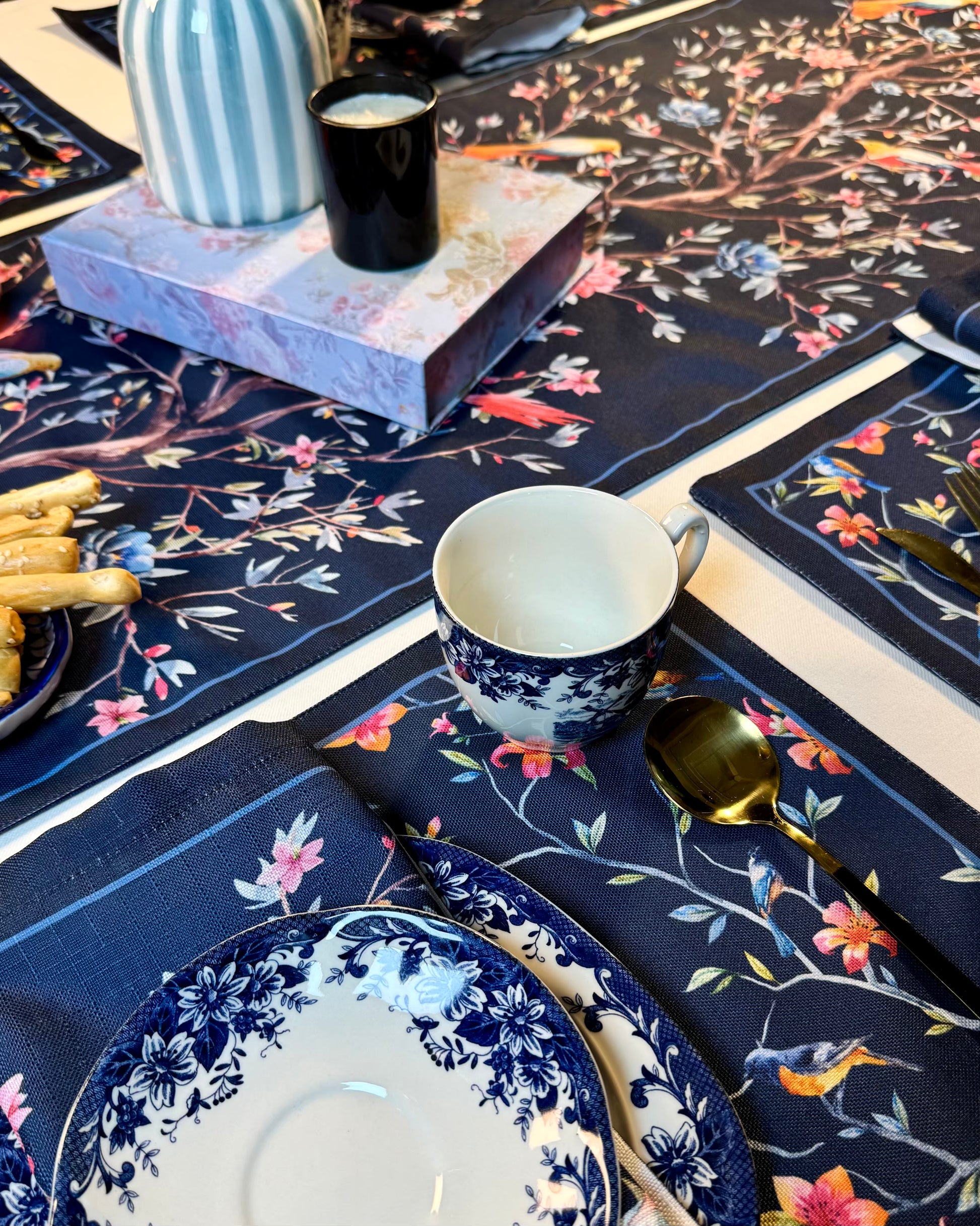 A symphony of colour unfolds across a deep navy canvas, where cheerful birds perch among blossoms in shades of pink, orange, and yellow. Delicate branches weave through the design, creating a harmonious, repeating pattern that fills the placemat with life and movement.