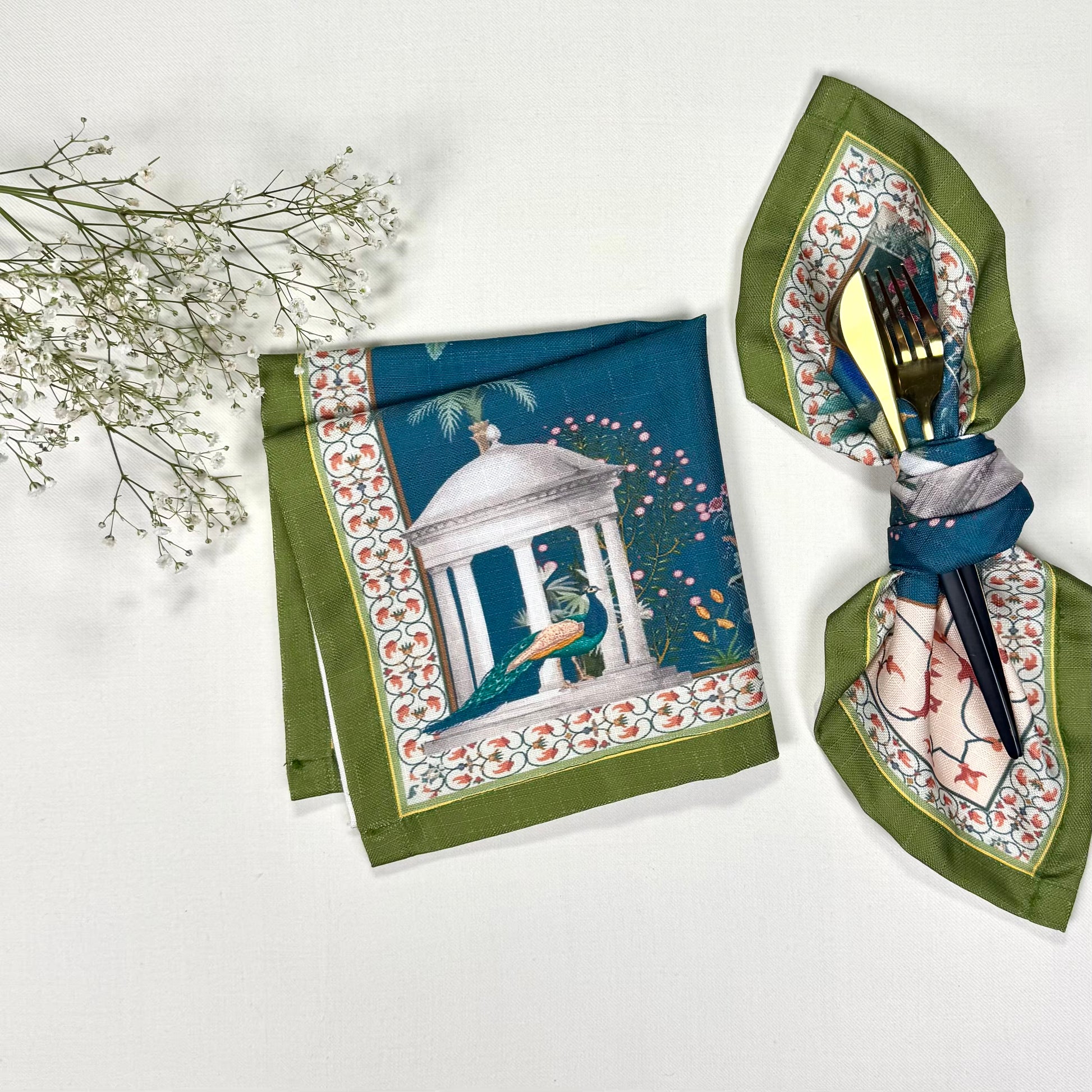 Step into a teal-hued paradise where ornate stone arches blend with lush palms and vibrant blooms. Majestic peacocks and a scarlet macaw add pops of color, all framed by delicate lattice details. Perfect for bringing timeless tropical elegance to any space.