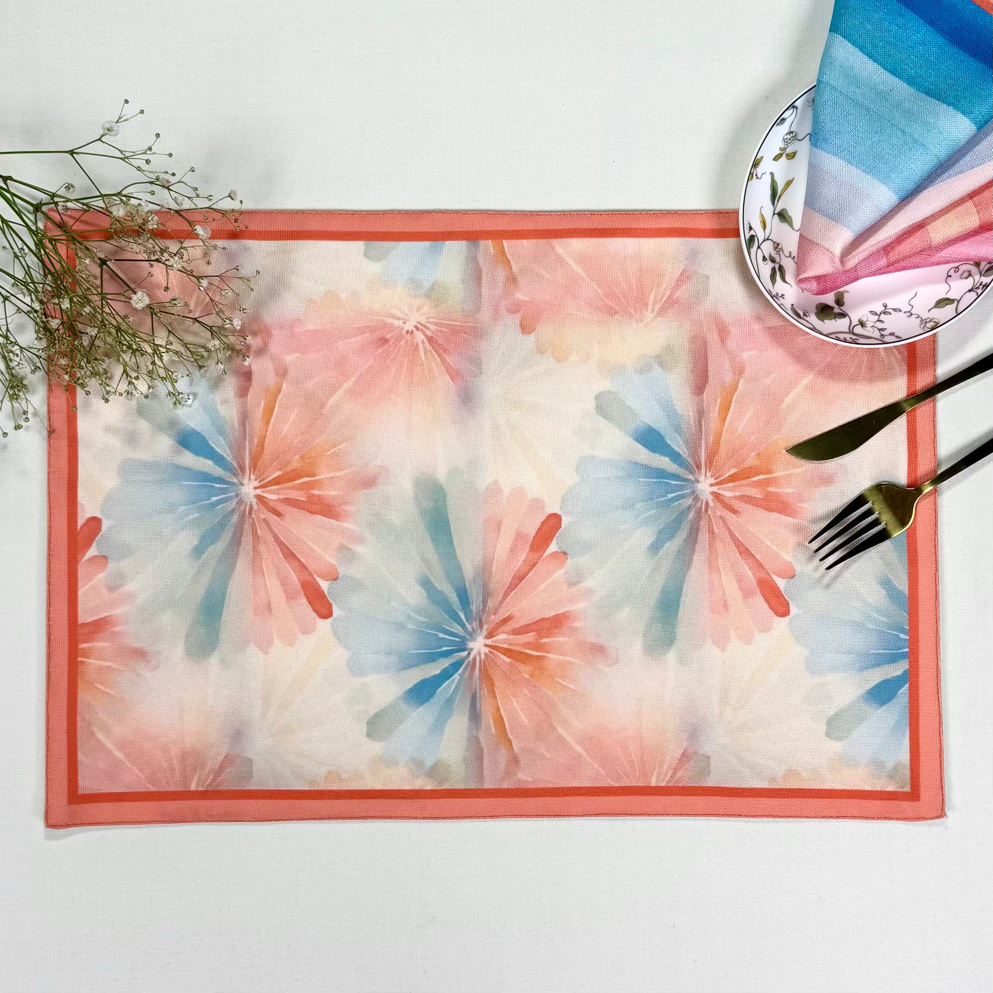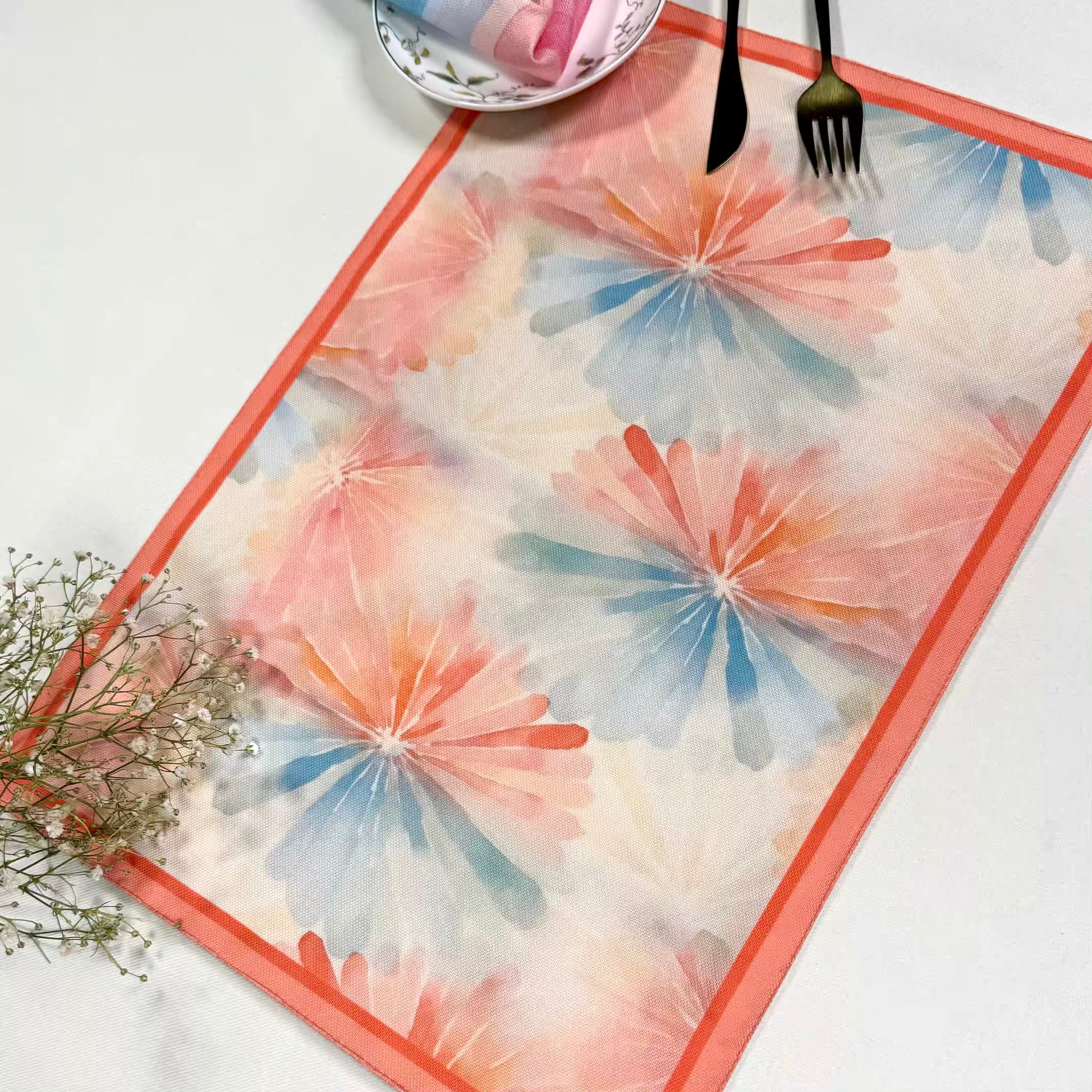 Petals like whispered brushstrokes bloom in soft coral, peach, and light blue, drifting gently across a serene, creamy canvas. Each cluster flows with the delicate fluidity of watercolour, colours blending and bleeding softly into one another, airy and luminous. A coral border frames the scene like a quiet, warm embrace, while subtle textures beneath invite the touch, turning colour and form into gentle, tactile poetry.