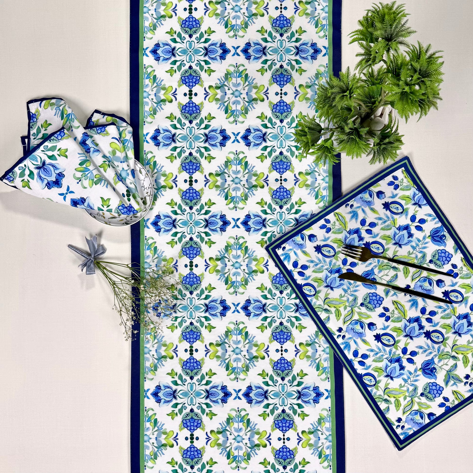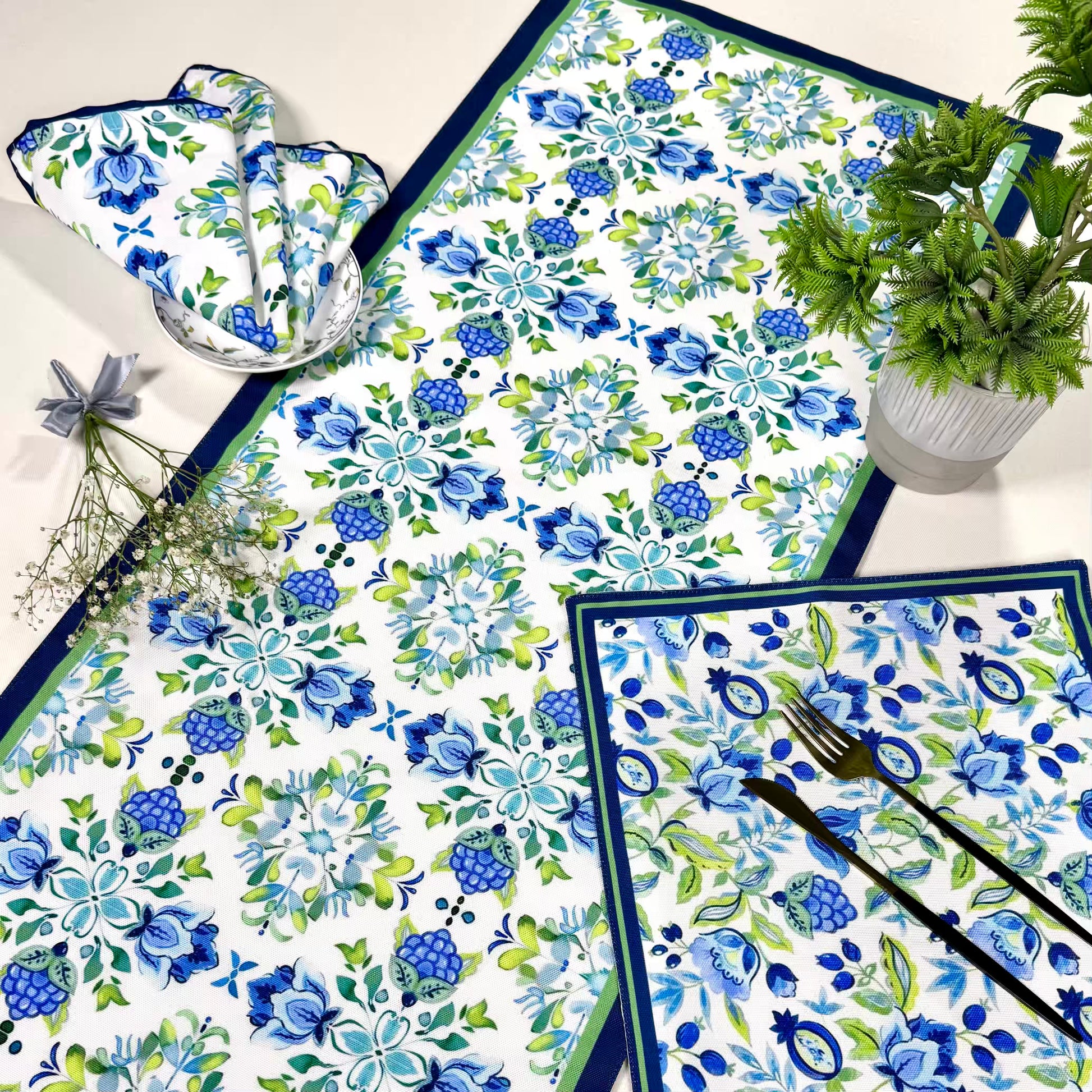 Where classic design meets modern sophistication. A delicate dance of blue flowers, lush green leaves, and rich navy berries unfolds across a pristine white background, creating a pattern that's both timeless and vibrant. Framed with a subtle double border of deep navy and soft sage, it's a perfect blend of refinement and personality.