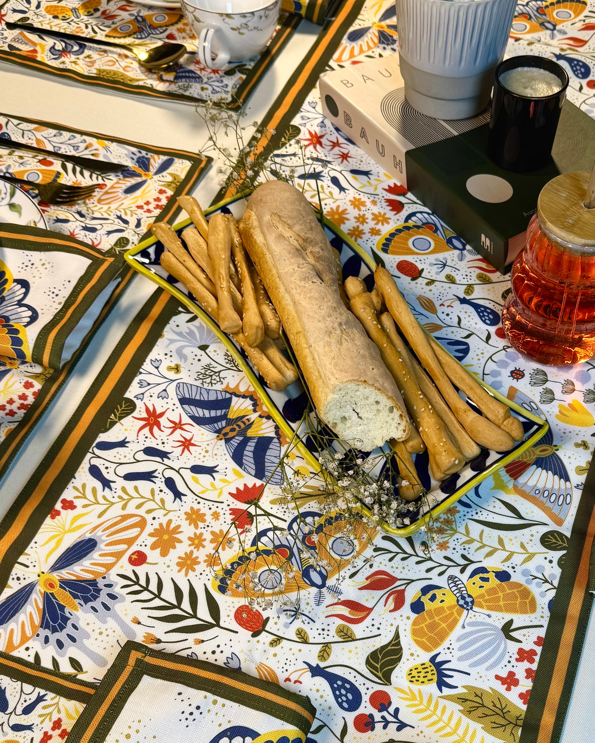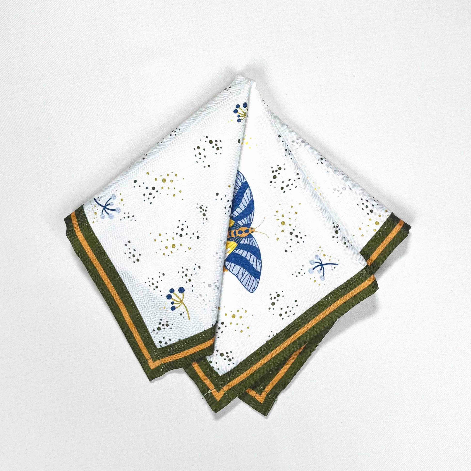 A flutter of colour comes alive across a crisp white canvas, where butterflies and moths dance gracefully among vibrant blooms and lush foliage. Each wing, petal, and leaf is meticulously detailed, forming a cheerful, repeating pattern that brings harmony and joy to the design. A subtle dark olive-green border frames the composition, adding a refined finishing touch.