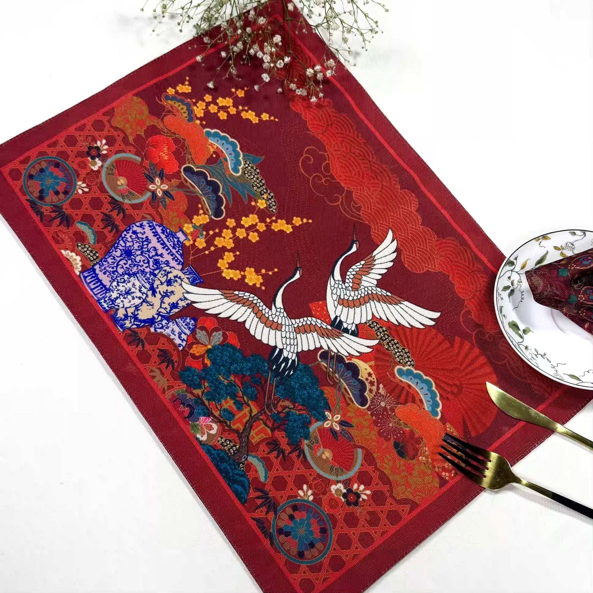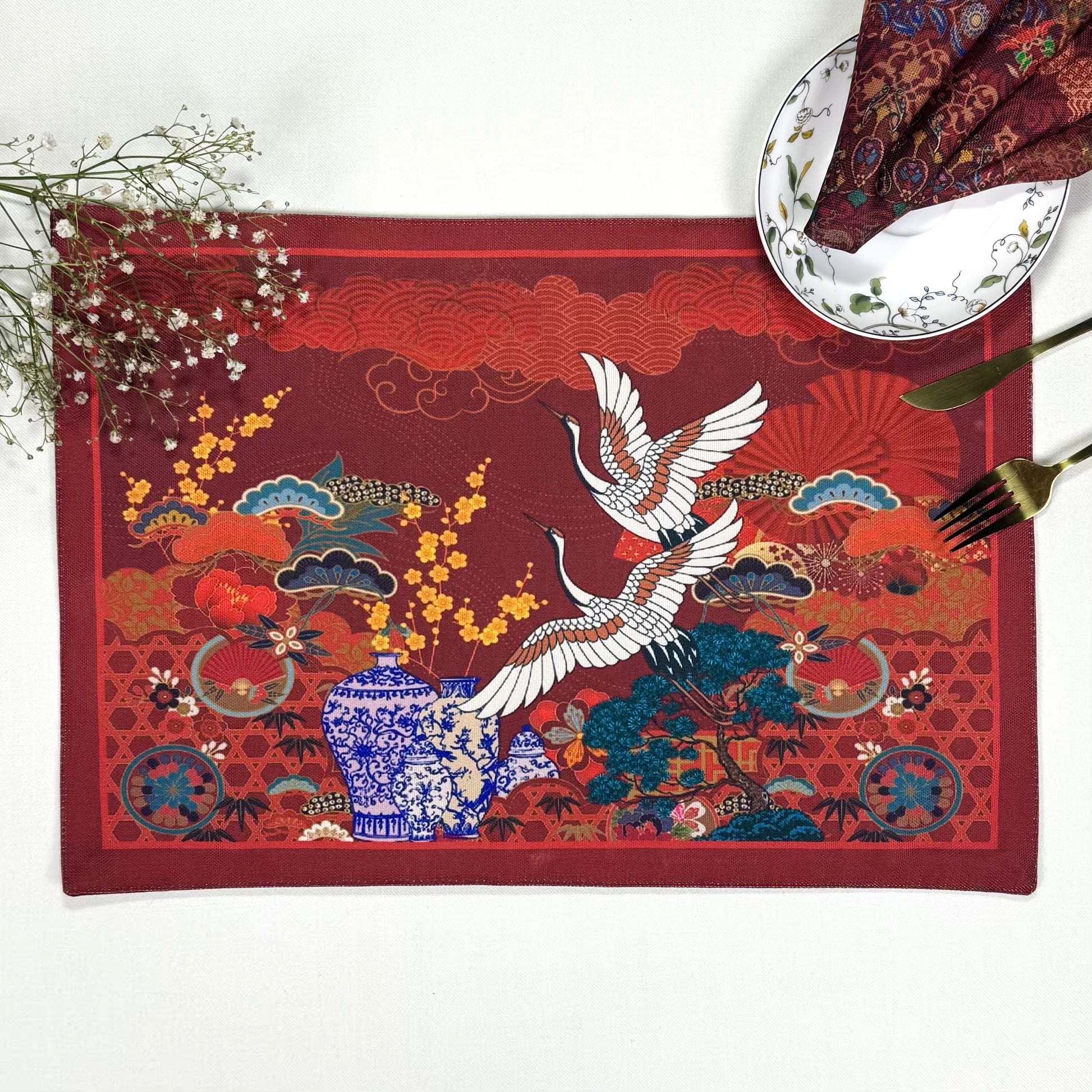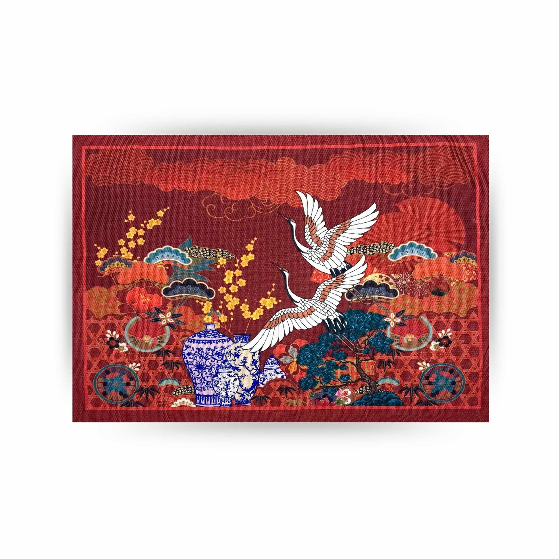 A stunning masterpiece on deep burgundy-two elegant cranes soar gracefully amid golden plum blossoms and delicate bamboo. Intricate blue-and-white ceramic vases and stylized clouds add timeless East Asian charm. Rich colors and textured stitching bring this vibrant scene to life with movement and depth.