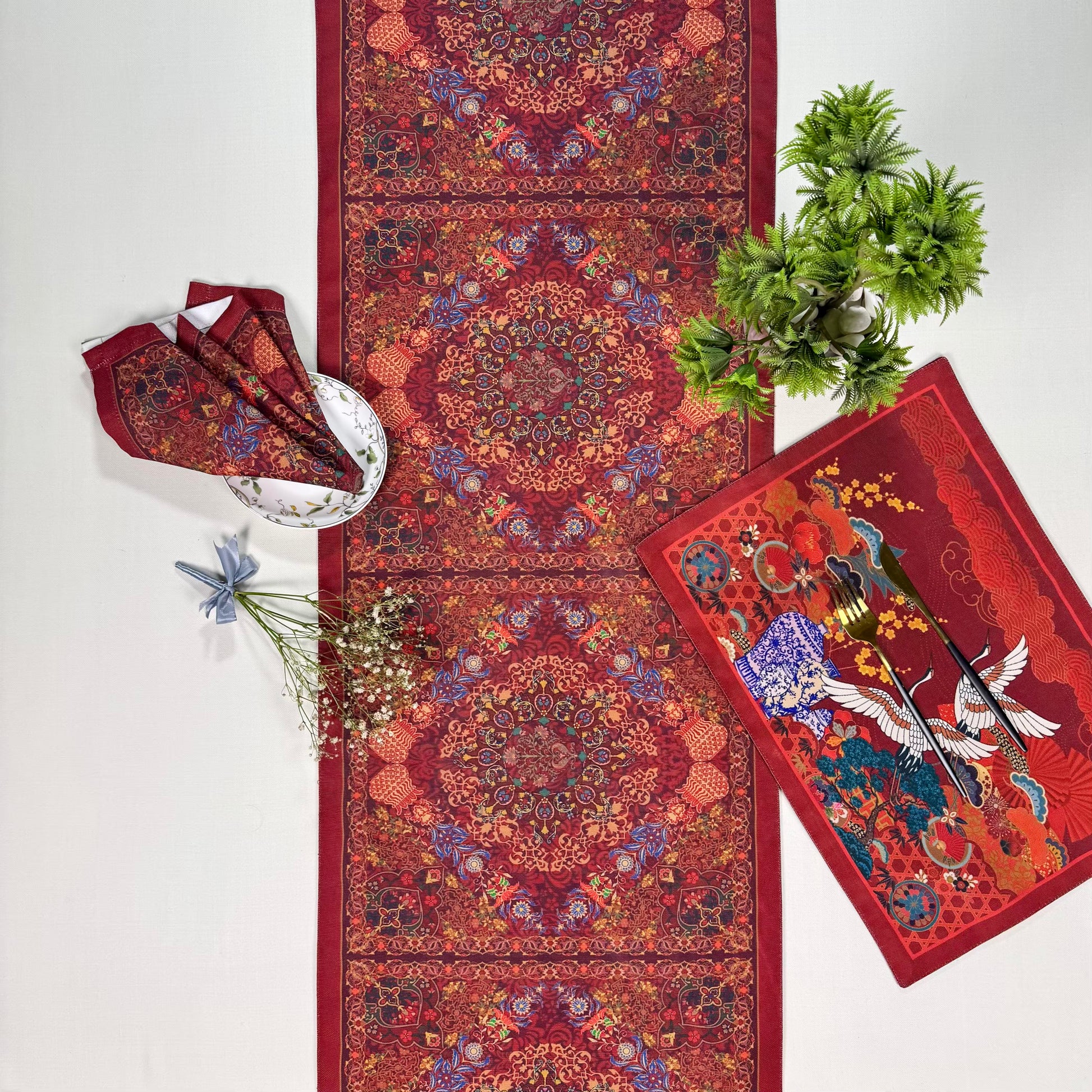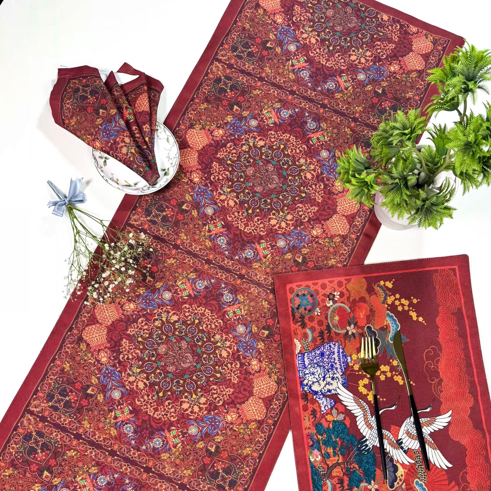 A stunning masterpiece on deep burgundy-two elegant cranes soar gracefully amid golden plum blossoms and delicate bamboo. Intricate blue-and-white ceramic vases and stylized clouds add timeless East Asian charm. Rich colors and textured stitching bring this vibrant scene to life with movement and depth.