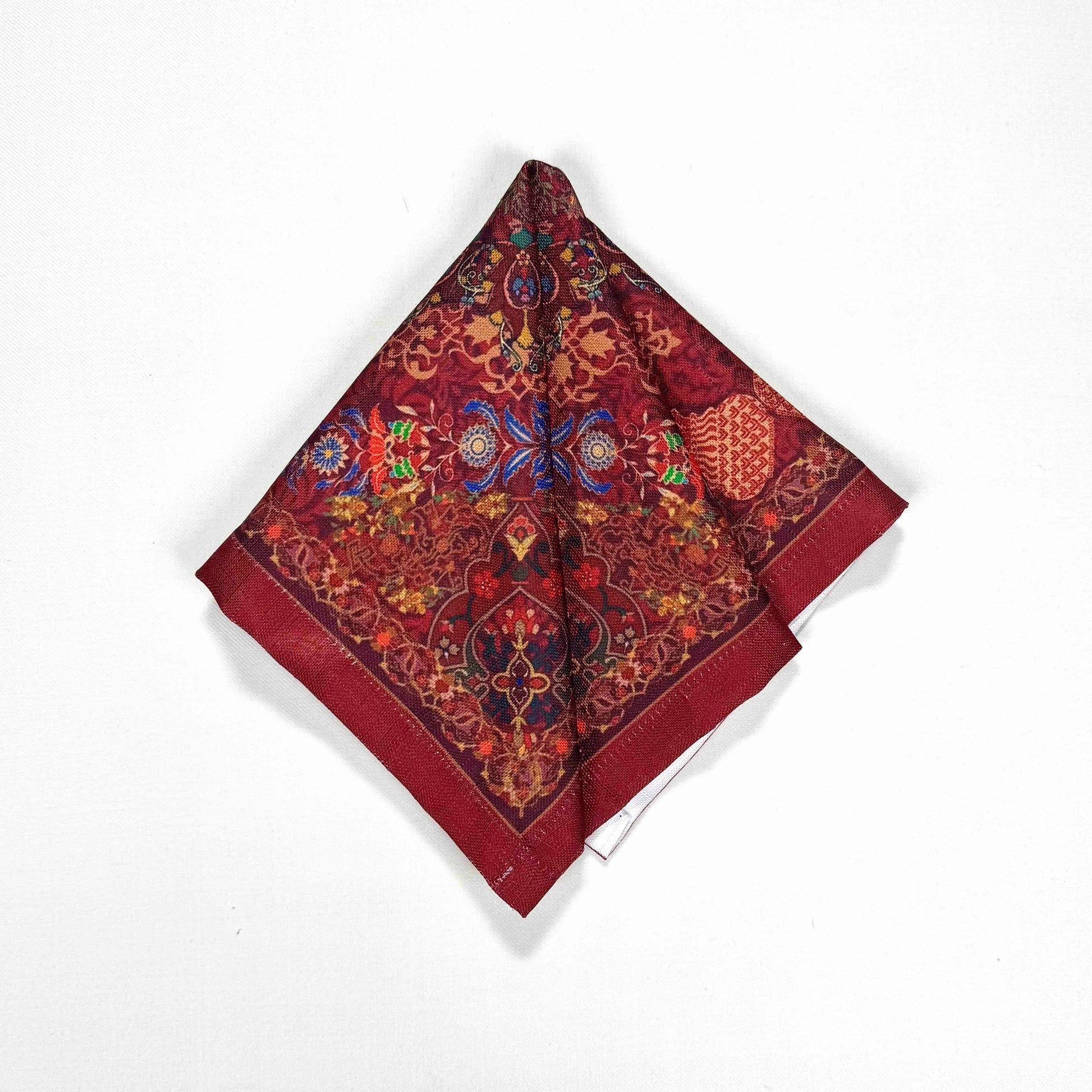 A stunning masterpiece on deep burgundy-two elegant cranes soar gracefully amid golden plum blossoms and delicate bamboo. Intricate blue-and-white ceramic vases and stylised clouds add timeless East Asian charm. Rich colours and textured stitching bring this vibrant scene to life with movement and depth.