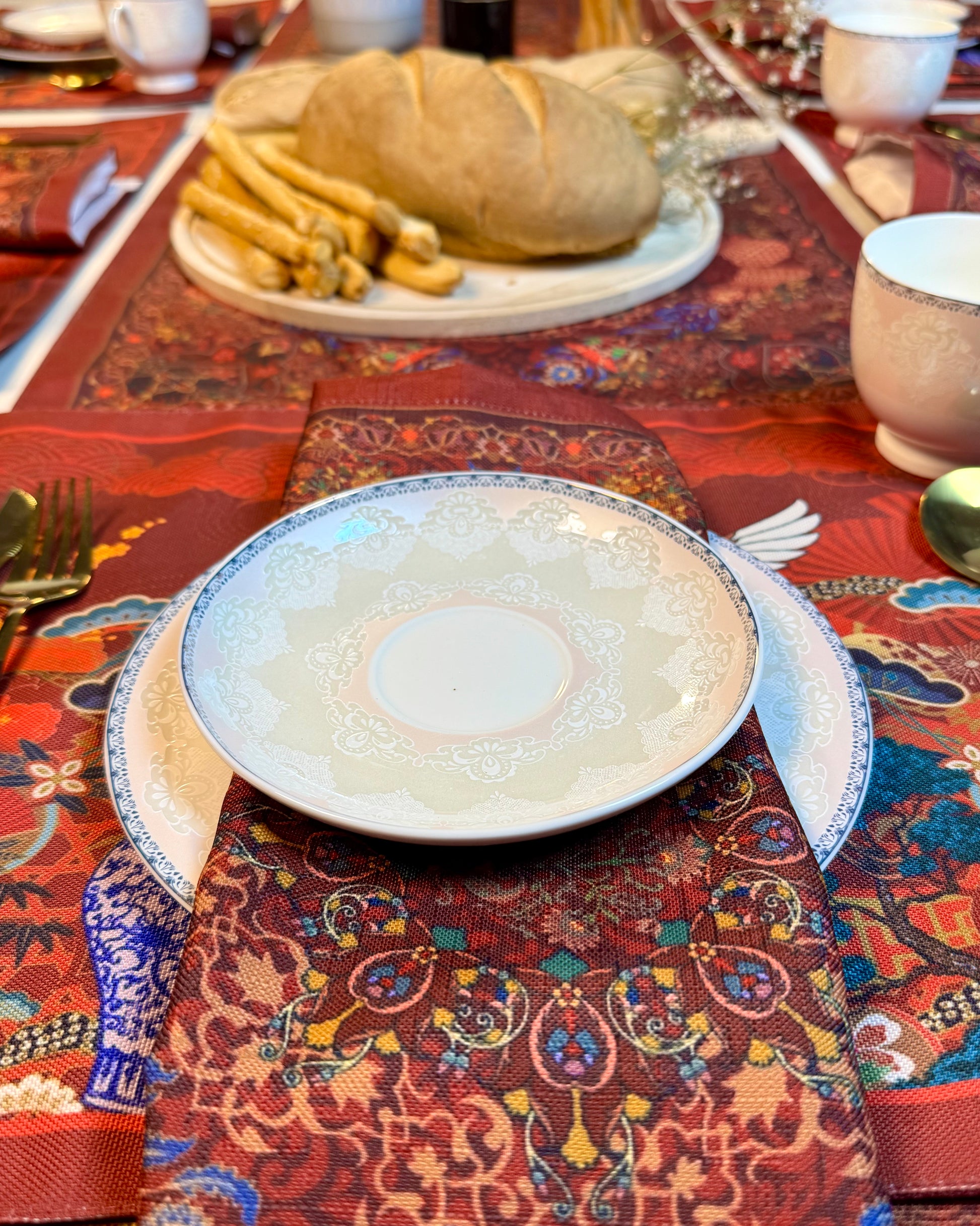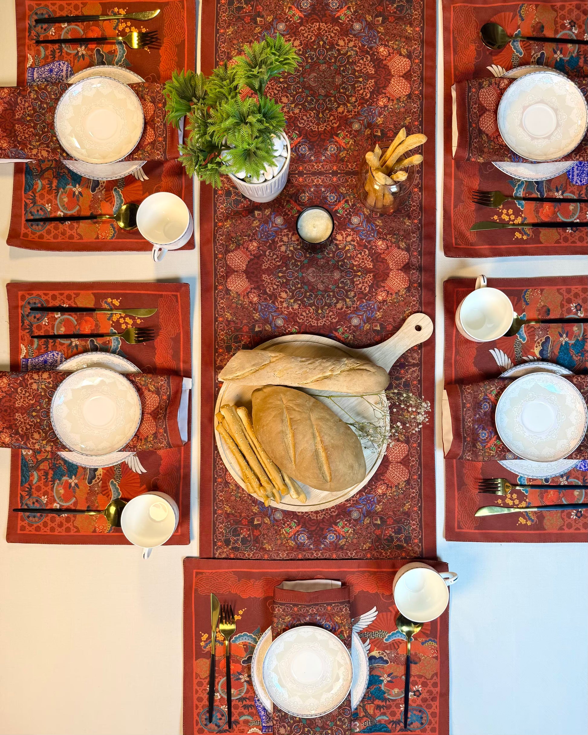 - 5 piece set contains: One (1) Runner of 72 x 15 inches and four (4) placemats of 12 x 18 inches each
