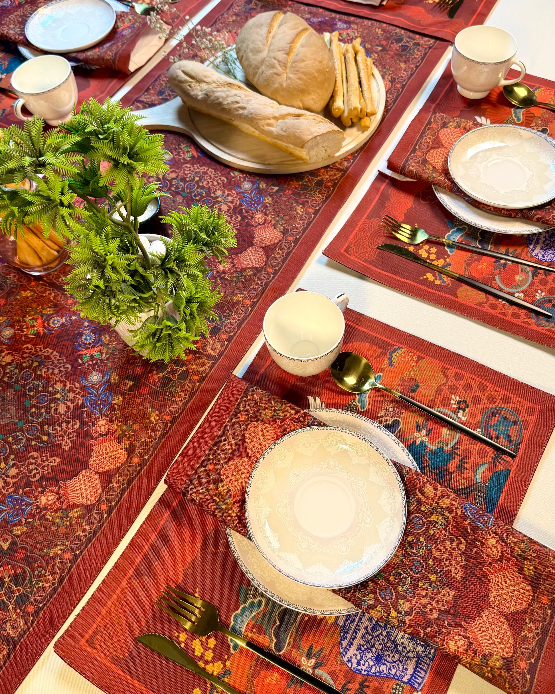 - 9 piece set contains: One (1) Runner of 110 x 15 inches and eight (8) placemats of 12 x 18 inches