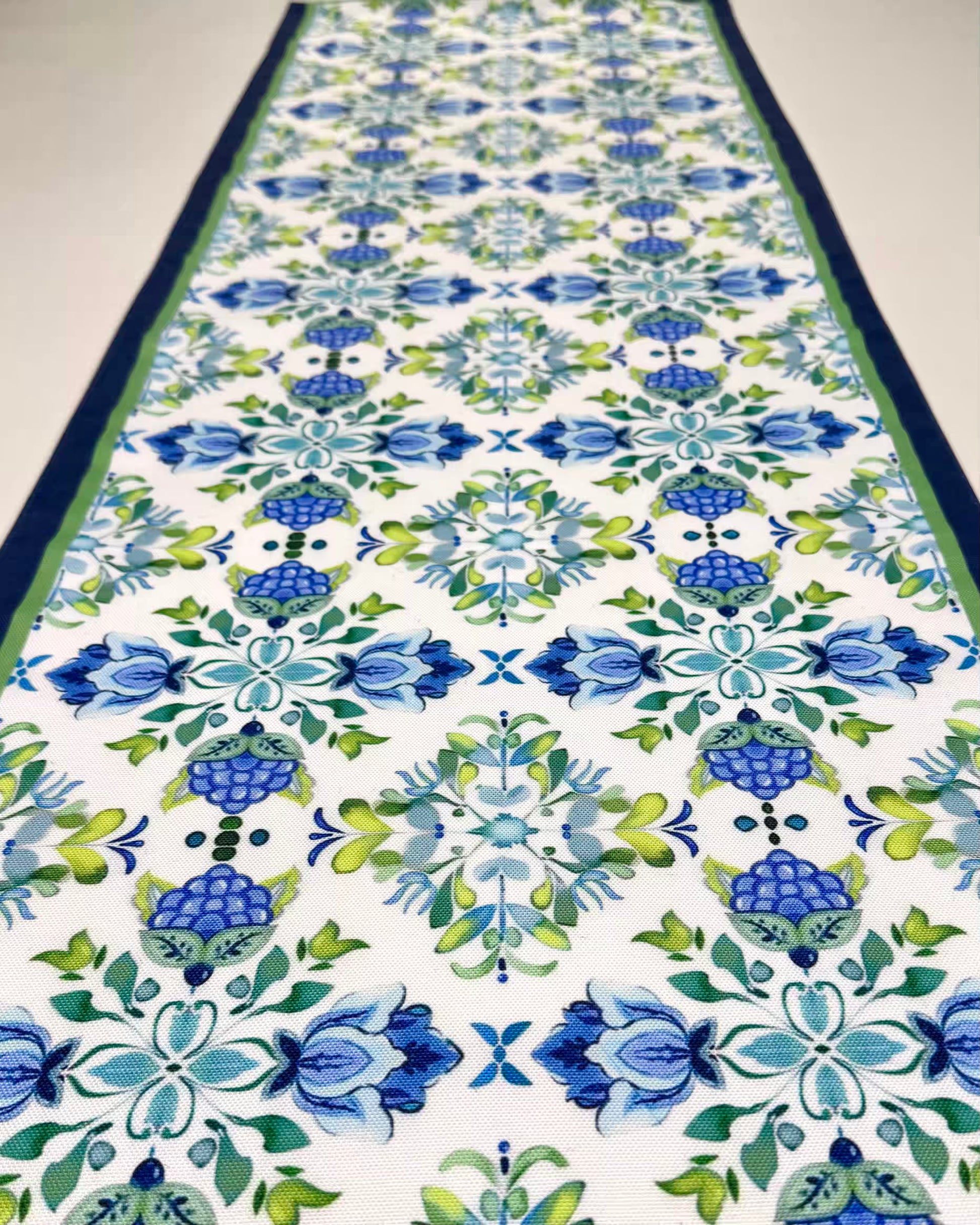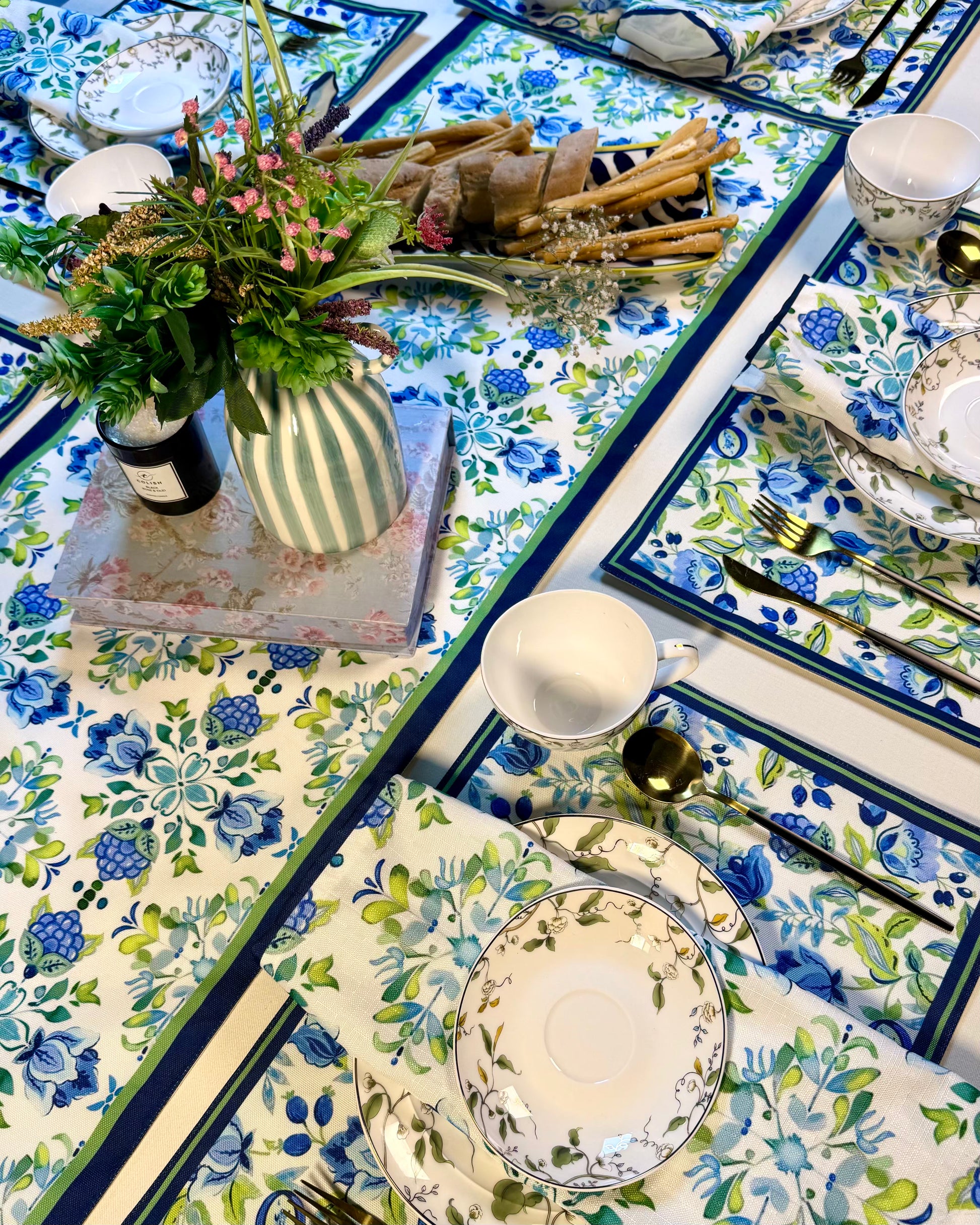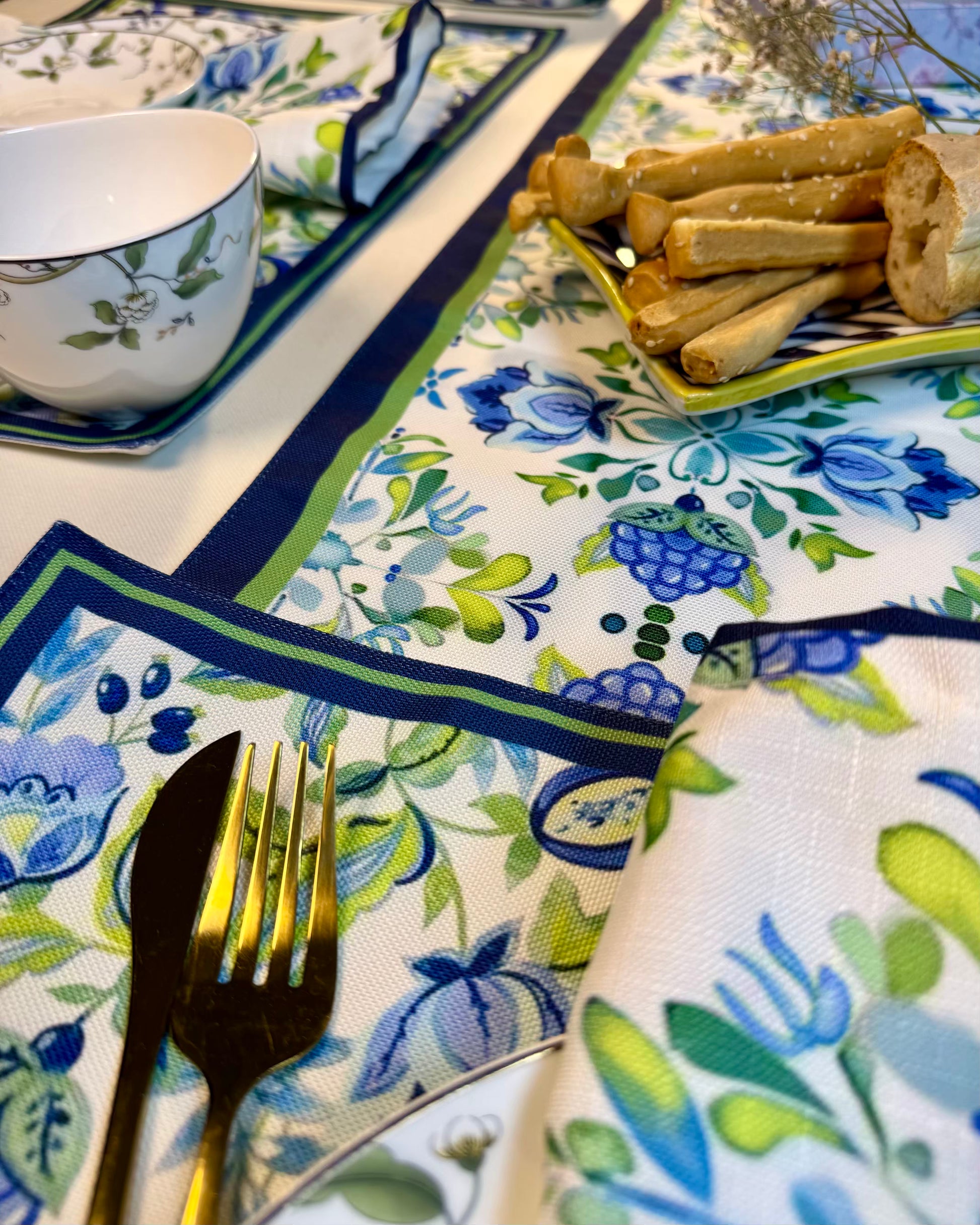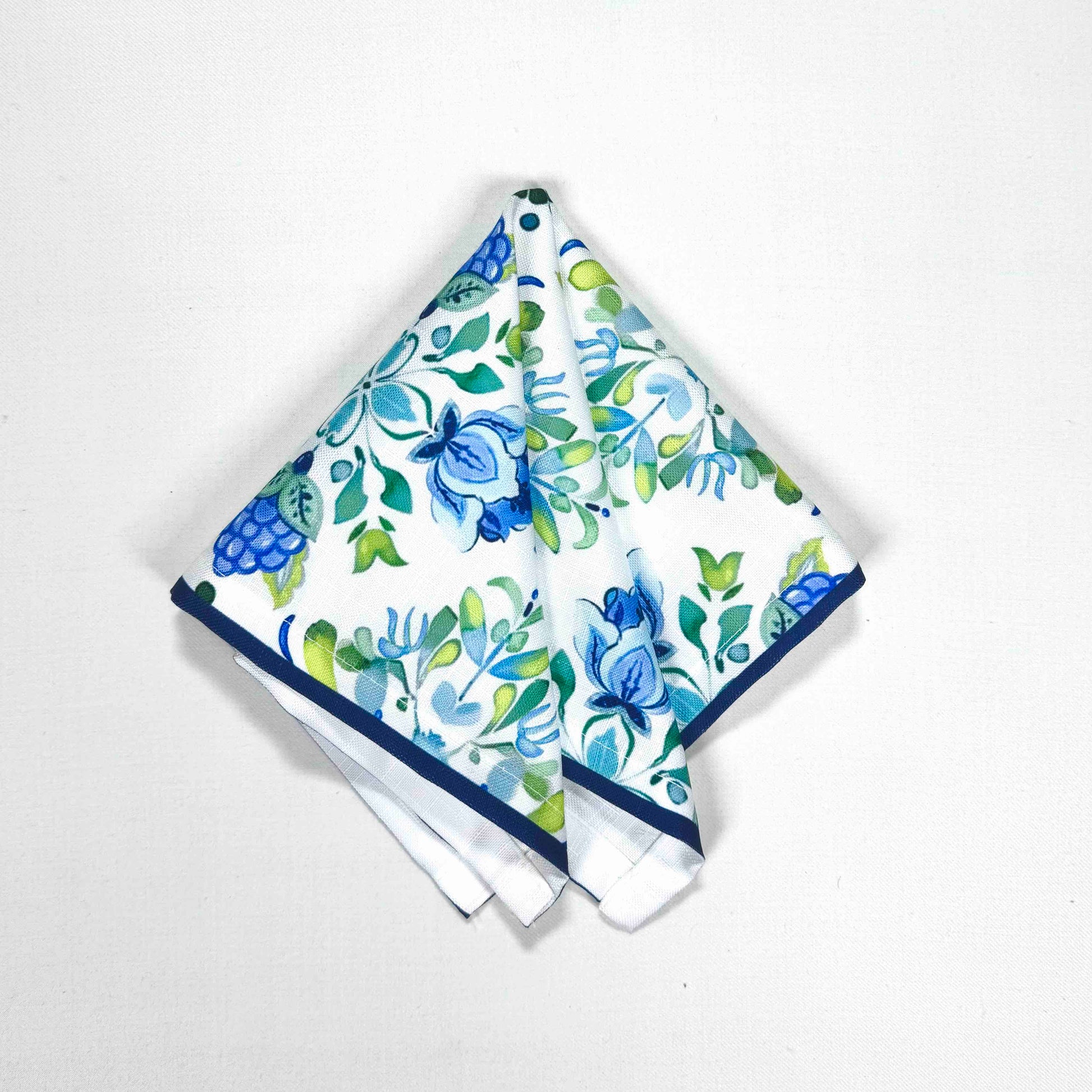 Where classic design meets modern sophistication. A delicate dance of blue flowers, lush green leaves, and rich navy berries unfolds across a pristine white background, creating a pattern that's both timeless and vibrant. Framed with a subtle double border of deep navy and soft sage, it's a perfect blend of refinement and personality.