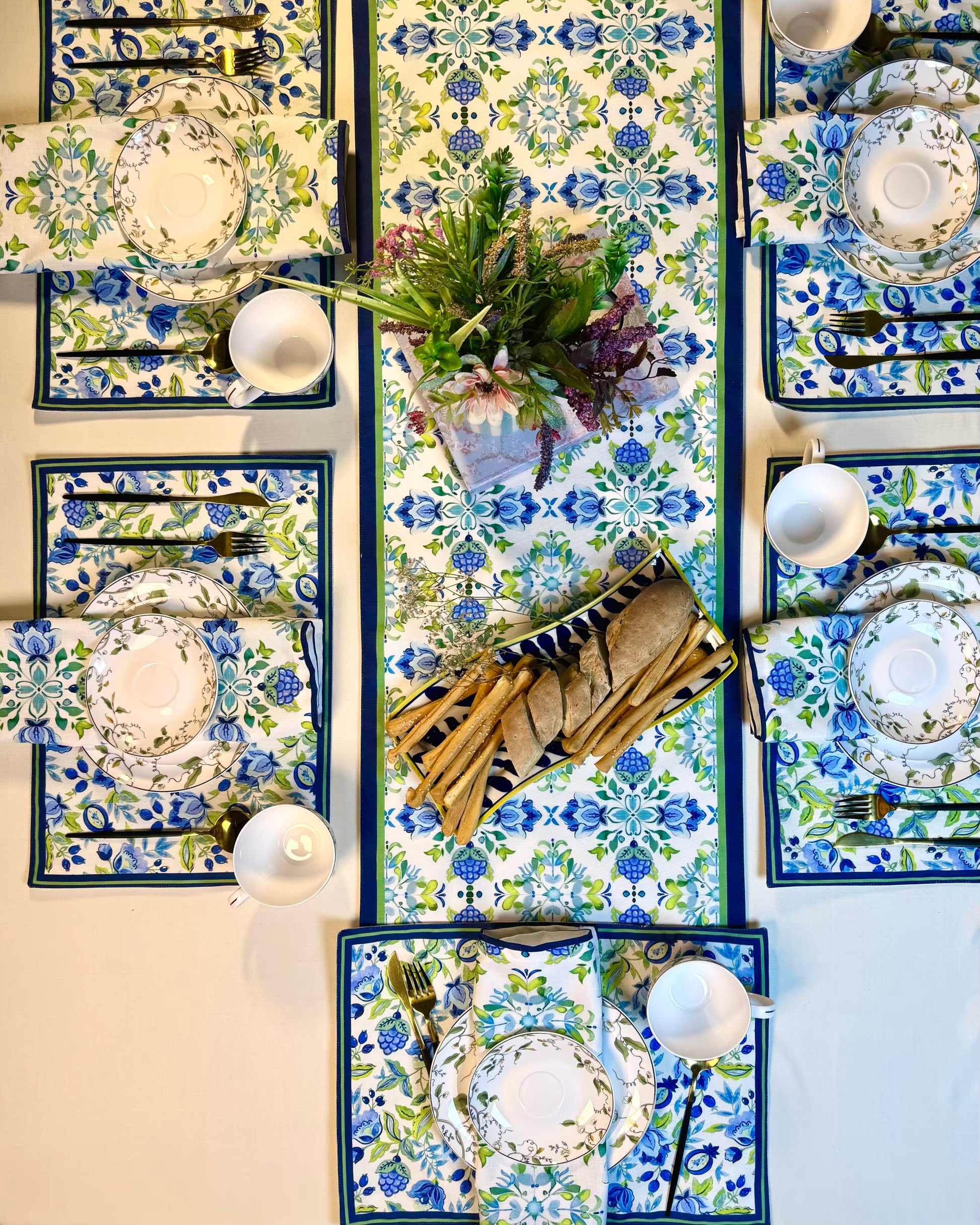- 5 piece set contains: One (1) Runner of 72 x 15 inches and four (4) placemats of 12 x 18 inches each